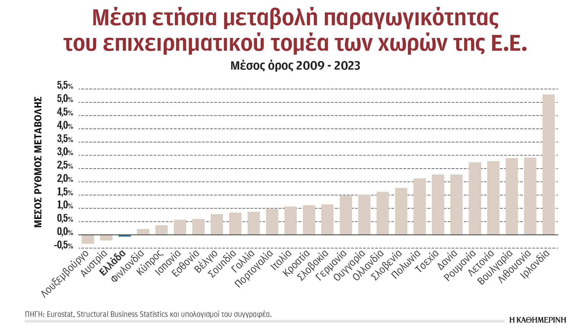 Πηγαίνοντας ακόμη πιο πίσω στον χρόνο, ώστε να περιληφθεί και η περίοδος της κρίσης, το ΚΕΠΕ παρουσίασε στο προχθεσινό του δελτίο «Οικονομικές Εξελίξεις» στοιχεία σύμφωνα με τα οποία η μέση ετήσια παραγωγικότητα του επιχειρηματικού τομέα την περίοδο 2009-2023 στην Ελλάδα ήταν ελαφρώς αρνητική, κάτι που την κατατάσσει στην τρίτη χειρότερη θέση στην Ε.Ε. για τη συγκεκριμένη περίοδο, μετά το Λουξεμβούργο και την Αυστρία, που είχαν επίσης αρνητικές επιδόσεις. Οπως αναφέρει ο συγγραφέας της μελέτης Βλάσης Μισσός, «το διαχρονικό επίπεδο μεταβολής της παραγωγικότητας στην Ελλάδα είναι ουσιαστικά μηδενικό, καλύπτοντας μια μακρά περίοδο κατά την οποία οι επιπτώσεις της κρίσης δεν έχουν ακόμη εξασθενήσει».