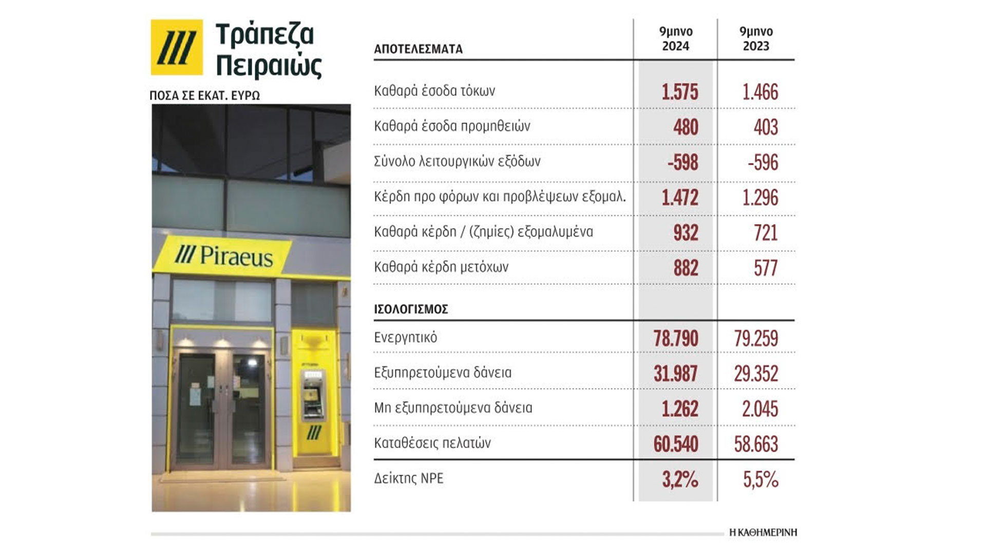 Ιστορικό υψηλών καθαρών κερδών 932 εκατ. ευρώ παρουσίασε το 9μηνο η Τράπεζα Πειραιώς (αντιστοιχούν σε κέρδη ανά μετοχή 0,72 ευρώ και ενσωματώνουν ετήσια άνοδο 31%), οδηγώντας σε επικαιροποίηση του στόχου για κέρδη ανά μετοχή άνω των 0,90 ευρώ τo 2024.