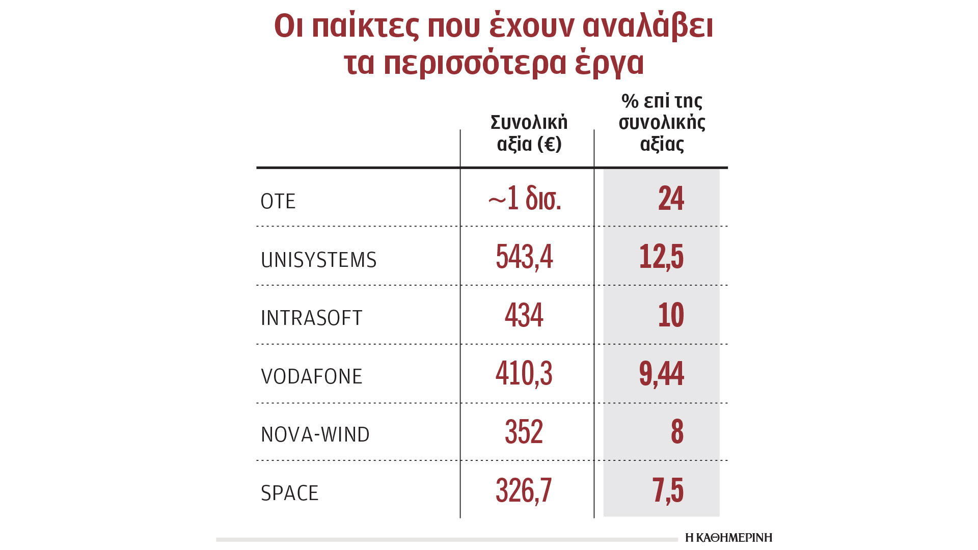 Τη μερίδα του λέοντος κατέχει ο όμιλος ΟΤΕ, που έχει αναλάβει συμβάσεις της τάξης του 1 δισ. ευρώ, ποσό που αντιστοιχεί στο 24% της συνολικής αξίας των έργων. Το 50% της αξίας των πρότζεκτ που έχει αναλάβει ο ΟΤΕ αντιστοιχεί σε έργα που υλοποιεί ως μέλος κοινοπραξίας. Στη δεύτερη θέση με μερίδιο 12,5% βρίσκεται η Unisystems του ομίλου Quest, που έχει αναλάβει έργα 543,3 εκατ. ευρώ, υλοποιώντας αυτόνομα μόνο το 15% αυτών. Ακολουθεί η Netcompany-Intrasoft με συνολικές συμβάσεις 434 εκατ. ευρώ, που αντιστοιχούν σε μερίδιο 10%.