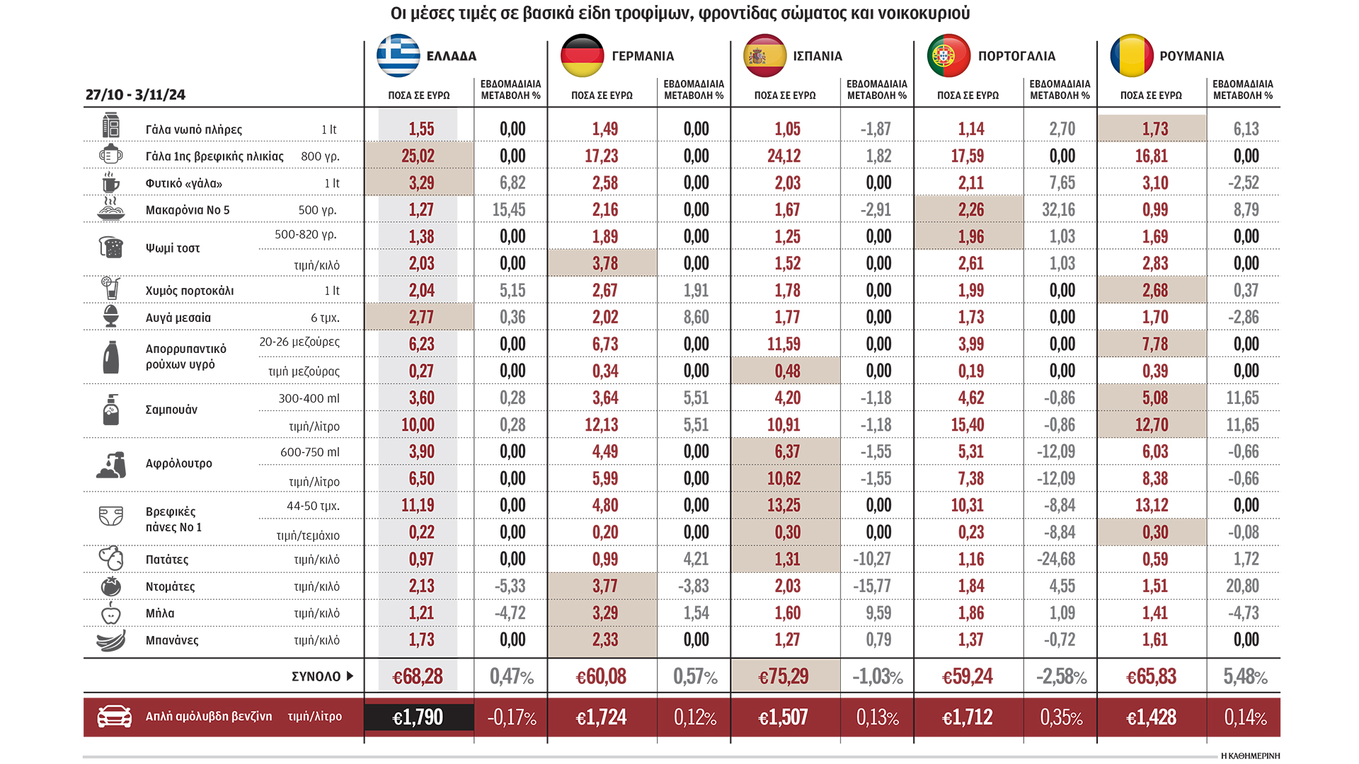 Σχεδόν 30 ευρώ περισσότερα κοστίζει σήμερα σε σύγκριση με το 2021 ένα αντιπροσωπευτικό «καλάθι» επώνυμων τυποποιημένων προϊόντων από 60 βασικές κατηγορίες ειδών σούπερ μάρκετ. Σύμφωνα με το εβδομαδιαίο βαρόμετρο της εταιρείας ερευνών αγοράς Circana, το οποίο δημοσιεύει στην ιστοσελίδα της η Ενωση Σούπερ Μάρκετ Ελλάδας (ΕΣΕ) το «καλάθι» αυτό κοστίζει σήμερα (με βάση τα στοιχεία της περιόδου από τις αρχές του χρόνου έως τις 13 Οκτωβρίου 2024) 210,47 ευρώ έναντι 181,97 ευρώ το 2021 και 197,82 ευρώ το 2022. Με άλλα λόγια, για το ίδιο «καλάθι» φέτος πληρώνουμε 342 ευρώ περισσότερα σε ετήσια βάση ή το 41% του κατώτατου μισθού που σήμερα είναι 830 ευρώ (μεικτές αποδοχές). Διευκρινίζεται ότι τα στοιχεία για το 2021 και το 2022 προκύπτουν από τις τιμές ολόκληρου του έτους. Το 2023 το «καλάθι» είχε αξία 201,60 ευρώ, οριακά υψηλότερη από την αξία του στο δεκάμηνο (210,34 ευρώ). Οι 60 κατηγορίες που εκπροσωπούνται στο «καλάθι» του εβδομαδιαίου βαρόμετρου αποτελούν το 72% των πωλήσεων των σούπερ μάρκετ.