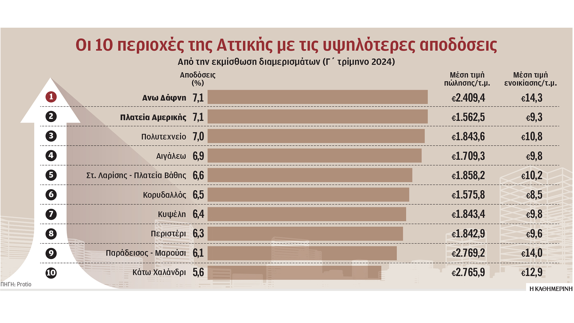 Στην πρώτη δεκάδα βρίσκονται κυρίως περιοχές του κέντρου της Αθήνας και των δυτικών προαστίων, όπως το Αιγάλεω (4ο στη σχετική κατάταξη), η περιοχή πέριξ της πλατείας Βάθης και του Σταθμού Λαρίσης, ο Κορυδαλλός, η Κυψέλη και το Περιστέρι. Πρόκειται για σημεία όπου οι τιμές των ενοικίων έχουν αυξηθεί σημαντικά τα τελευταία χρόνια και ειδικά την τελευταία διετία, με ρυθμό ταχύτερο από τις τιμές πώλησης. Η πλατεία Αμερικής και η περιοχή γύρω από το Πολυτεχνείο βρίσκονταν στην πρώτη δυάδα των περιοχών και κατά την αντίστοιχη έρευνα της Protio πριν από έξι μήνες. Ακολουθούσαν περιοχές, όπως η πλατεία Αττικής, ο Κορυδαλλός, το Αιγάλεω, η πλατεία Βικτωρίας και το Περιστέρι. Επομένως, δεν υπάρχει ιδιαίτερη διαφορά.