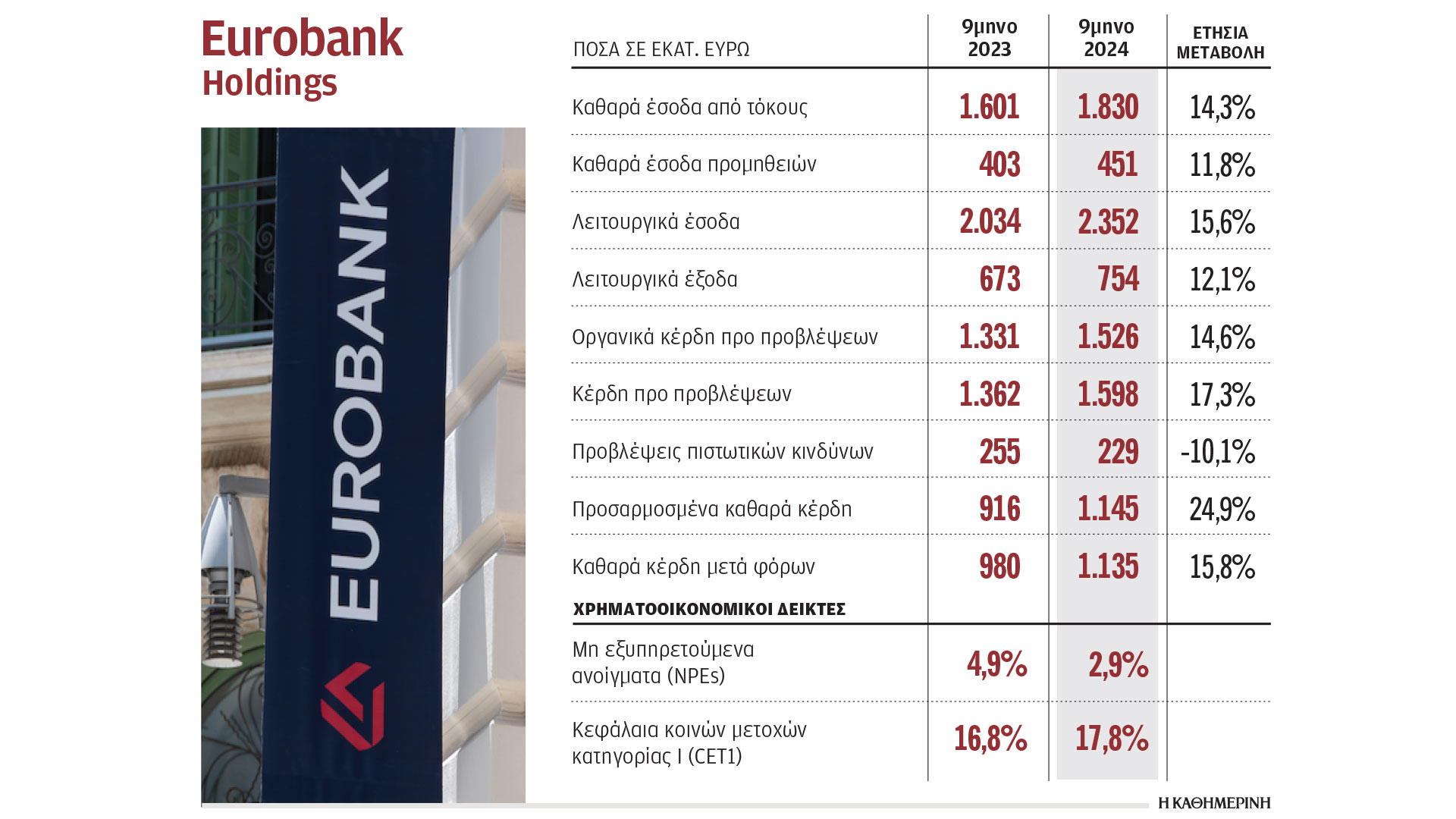Στο 1,1 δισ. ευρώ ανήλθαν στο 9μηνο τα προσαρμοσμένα καθαρά κέρδη του ομίλου Eurobank, αυξημένα κατά 24,9% (9,2% εξαιρουμένης της Ελληνικής Τράπεζας) σε ετήσια βάση. Τα κέρδη ανά μετοχή και η απόδοση των ενσώματων ιδίων κεφαλαίων διαμορφώθηκαν σε 0,31 ευρώ και 19,2% αντίστοιχα.