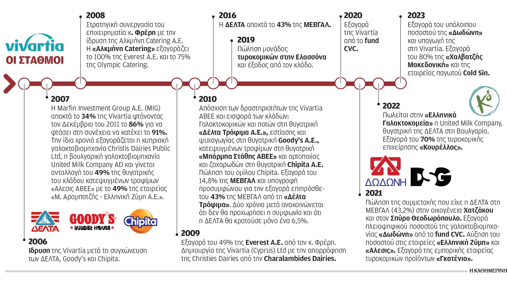 Δεκαοκτώ χρόνια μετά την ίδρυσή της το 2006, όταν οι πανίσχυροι τότε Δημήτρης Δασκαλόπουλος και Σπύρος Θεοδωρόπουλος ένωσαν τις εταιρείες τους ΔΕΛΤΑ και Chipita και τις δυνάμεις τους, η Vivartia, το παιδί αυτού του «γάμου», βρίσκεται ενώπιον νέας αναδιάρθρωσης και αναδιοργάνωσης της δομής της. Στην πραγματικότητα δεν πρόκειται για μια αιφνιδιαστική εξέλιξη, δεδομένου ότι από την πρώτη στιγμή που η Vivartia πέρασε στον έλεγχο του CVC, ενός fund δηλαδή, ήταν γνωστό ότι αυτό, μεσοπρόθεσμα, αφού θα επιτύχει τις υπεραποδόσεις που θέλει από την επένδυσή του, θα αποχωρήσει πουλώντας τις εταιρείες του ομίλου. Αυτή τη στιγμή βρίσκονται σε εξέλιξη έντονες διεργασίες και στους τρεις κλάδους του ομίλου –γαλακτοκομικά, εστίαση και κατεψυγμένα– με αλλαγές στη δομή και στα πρόσωπα, καθώς και στο προϊοντικό χαρτοφυλάκιό του, ενώ όλους τους προηγούμενους μήνες έγιναν κινήσεις νέας αναδιάρθρωσης του δανεισμού.