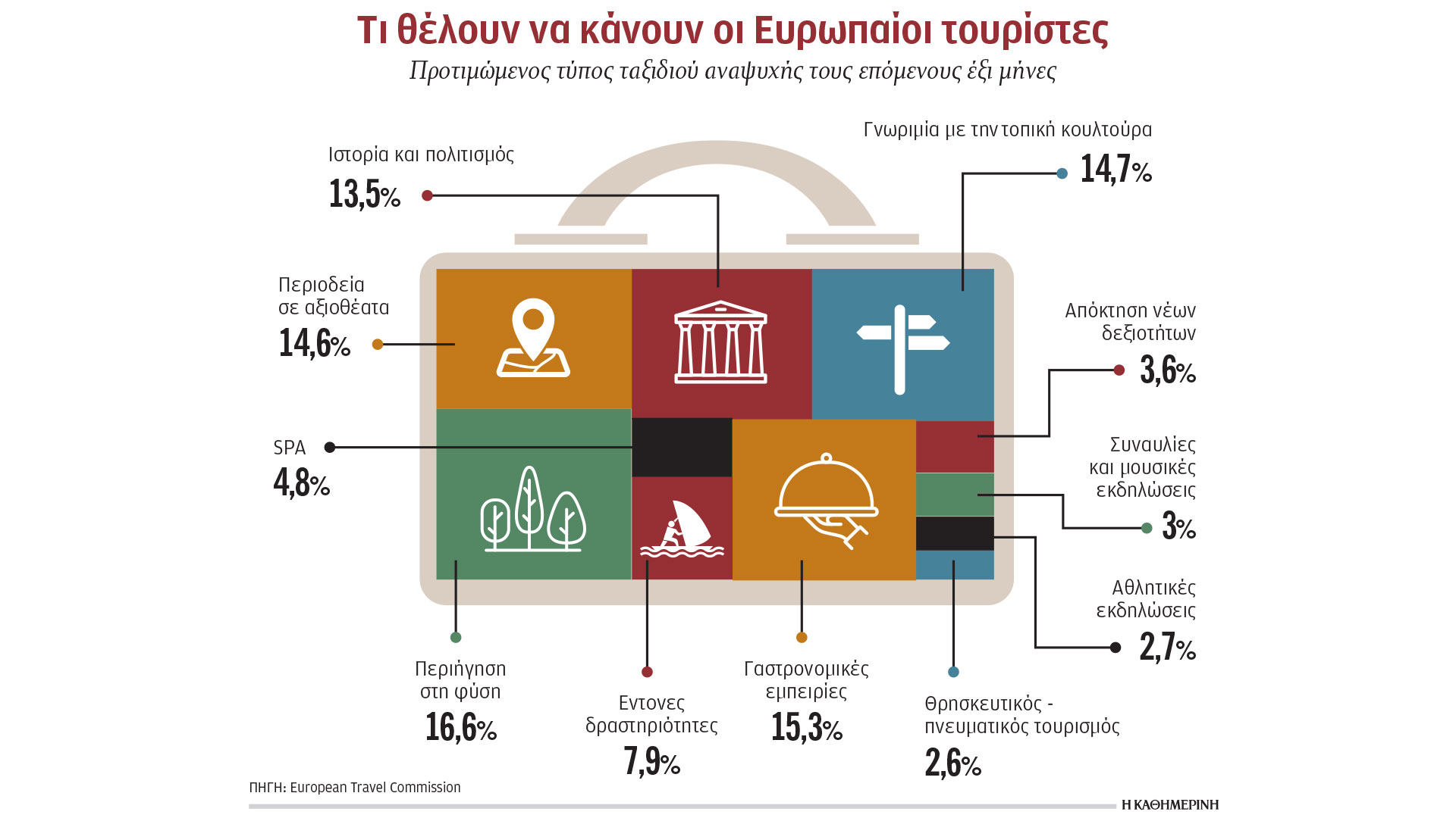 Σύμφωνα με την έρευνα «Monitoring Sentiment for Intra-European Travel» της ETC, που αποτελεί την ομοσπονδία των ευρωπαϊκών οργανισμών τουρισμού, οι ερωτηθέντες από τις μεγαλύτερες αγορές ταξιδιωτών της Ευρώπης επιδεικνύουν ιδιαίτερα έντονη προθυμία για ταξίδια. Το Ηνωμένο Βασίλειο προηγείται, με το 84% των Βρετανών ερωτηθέντων να εκφράζει την επιθυμία να ταξιδέψει, αντικατοπτρίζοντας αύξηση 10% από το 2023, ενώ ακολουθούν οι Γερμανοί με 79% (αύξηση 16%) και οι Γάλλοι με 78% (αύξηση 15%).