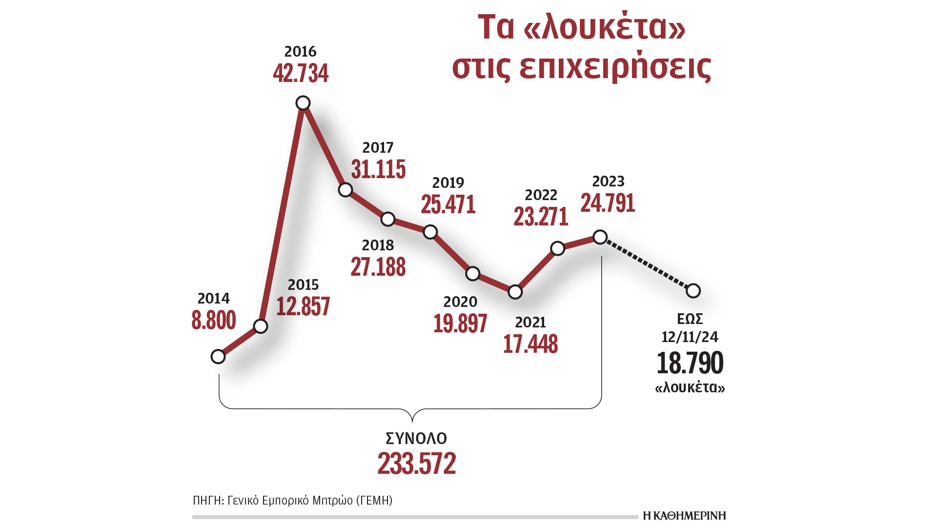 Σε ό,τι αφορά την τρέχουσα χρονιά, τα στοιχεία του ΓΕΜΗ δείχνουν ότι από τις αρχές του έτους μέχρι και χθες έκλεισαν 18.790 επιχειρήσεις, κατά 7,62% λιγότερες σε σύγκριση με το αντίστοιχο διάστημα του 2023. Σχεδόν 5.000 είναι εμπορικές, 3.500 είναι επιχειρήσεις καταλυμάτων και εστίασης, ενώ οι μεταποιητικές είναι 1.034. Σε κάθε περίπτωση, το ισοζύγιο στη δεκαετία 2014-2023 είναι θετικό και εξακολουθεί να είναι και φέτος. Ετσι, τη δεκαετία 2014-2023 άνοιξαν, σύμφωνα με τα στοιχεία του ΓΕΜΗ, 449.054 επιχειρήσεις, ενώ φέτος έχουν ανοίξει μέχρι στιγμής 56.133, κατά 3,54% περισσότερες σε σύγκριση με το αντίστοιχο περυσινό διάστημα.