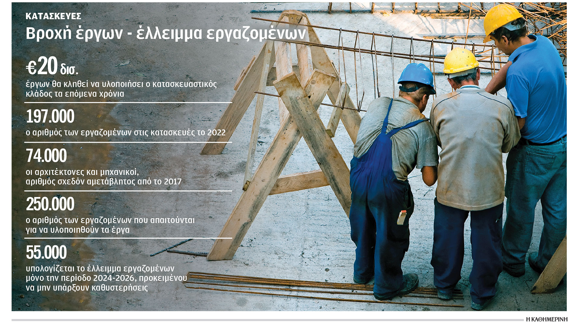 Εκδηλος είναι ο προβληματισμός των διοικήσεων των κατασκευαστικών εταιρειών αναφορικά με την εύρεση των απαιτούμενων ανθρώπων, προκειμένου να εκτελέσουν τις συμβάσεις που έχουν αναλάβει, ύψους περίπου 15-16 δισ. ευρώ, αλλά κι εκείνων που θα αναλάβουν τους επόμενους μήνες και υπολογίζονται σε τουλάχιστον άλλα 5-6 δισ. ευρώ έως το τέλος του 2025.