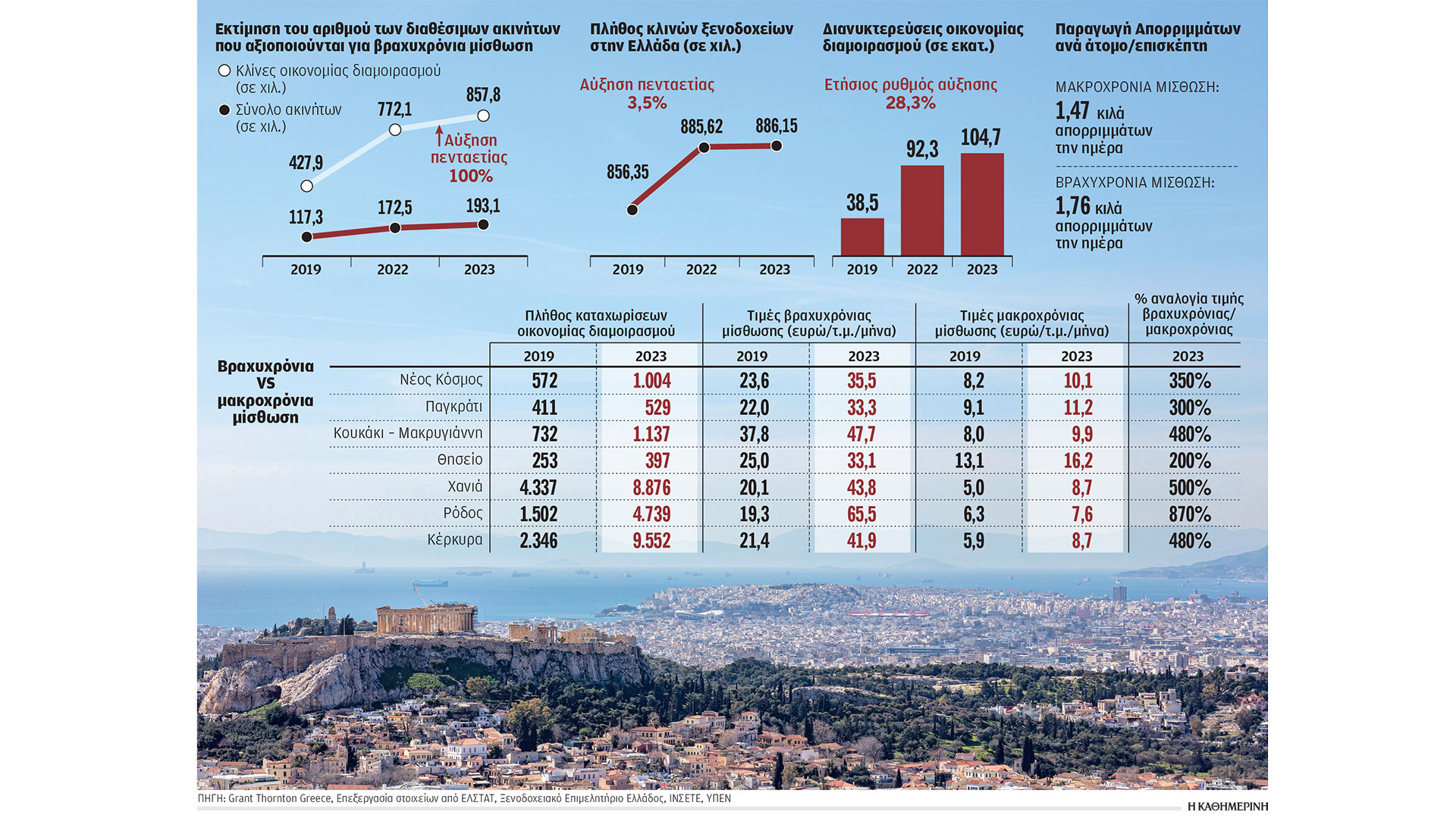 Σύμφωνα με στοιχεία του Ινστιτούτου του Συνδέσμου Ελληνικών Τουριστικών Επιχειρήσεων (ΙΝΣΕΤΕ), η προσφορά διαθέσιμων προς βραχυχρόνια μίσθωση κλινών (+90.000 κλίνες) τον Ιούλιο υπερέβη το 1 εκατομμύριο έναντι 888.000 κλινών στα ξενοδοχεία κατά τα τελευταία διαθέσιμα στοιχεία του Ξενοδοχειακού Επιμελητηρίου Ελλάδος. Εκτιμάται ωστόσο ότι χωρίς τη δυνατότητα φιλοξενίας ταξιδιωτών σε βραχυχρόνιες μισθώσεις, θα ήταν αδύνατον να ικανοποιηθεί η ζήτηση μόνον από τα ξενοδοχεία.