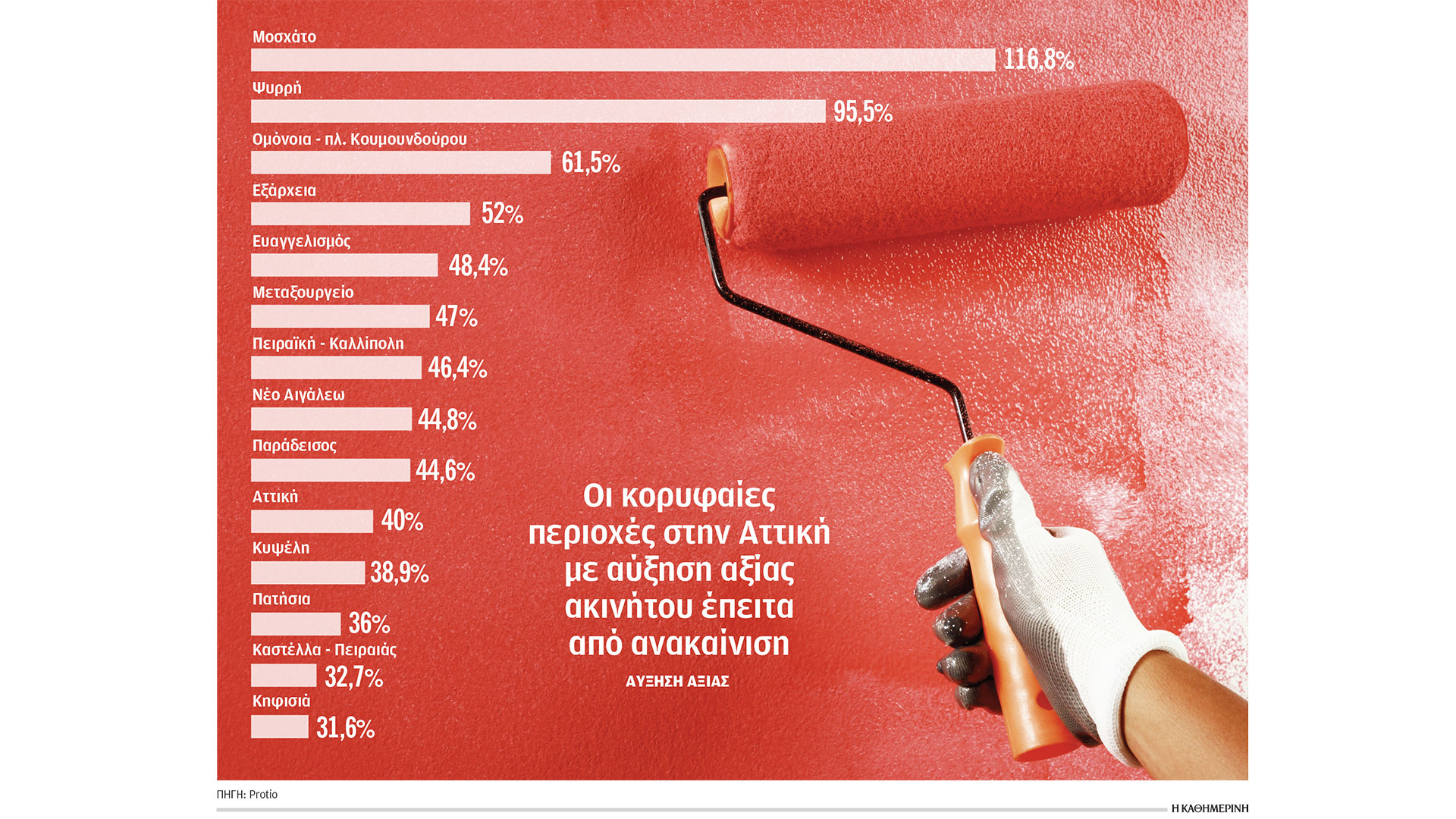 Ωστόσο, η υπεραξία αυτή αυξάνεται ακόμη περισσότερο αν το ακίνητο βρίσκεται σε περιοχές υψηλής ζήτησης είτε από αγοραστές είτε από επενδυτές. Η έρευνα της Protio καταγράφει μια λίστα 12 περιοχών όπου το όφελος από μια ανακαίνιση στην τιμή πώλησης αγγίζει το 58% κατά μέσον όρο, με αποκορύφωμα την περιοχή του Μοσχάτου, όπου μπορεί να αγγίξει ακόμη και το 116%! «Πρόκειται για μια περιοχή με υψηλή ζήτηση λόγω των βελτιωμένων υποδομών», σημειώνει η εταιρεία. Αντιστοίχως, αύξηση κατά 95,5% στην τιμή πώλησης επιτυγχάνεται από την ανακαίνιση σε κατοικίες στην περιοχή του Ψυρρή, ακριβώς επειδή το σημείο έχει μετατραπεί σε hotspot για τουριστικές αναπτύξεις και φιλοξενία. Στην Ομόνοια η υπεραξία μιας ανακαίνισης αγγίζει το 61,5%, καθώς η περιοχή αναβαθμίζεται συνεχώς, μέσω και της λειτουργίας νέων συγκροτημάτων και ξενοδοχείων. Στο Μεταξουργείο η αύξηση αγγίζει το 47%, λόγω της λειτουργίας νέων χώρων πολιτισμού και αναψυχής, ενώ στην περιοχή της Πειραϊκής η εγγύτητα με τη θάλασσα έχει αποτέλεσμα να αυξάνεται κατά 46,4% η τιμή πώλησης έπειτα από μια ανακαίνιση. Το Νέο Αιγάλεω εξασφαλίζει υπεραξία 44,8%, όντας μια περιοχή όπου υπάρχουν προσιτές επιλογές και εύκολη πρόσβαση σε συγκοινωνίες. Στα Εξάρχεια το όφελος διαμορφώνεται σε 52% και στον Ευαγγελισμό σε 48,4%. Επίσης, στον Παράδεισο Αμαρουσίου η αύξηση της αξίας από μια ανακαίνιση αγγίζει το 44,6% και στην πλατεία Αττικής σε 40%, ενώ στην Κυψέλη το κέρδος αγγίζει το 39%. Πιο μικρή είναι η ανατίμηση που επιτυγχάνεται στην Κηφισιά με 31,6%.