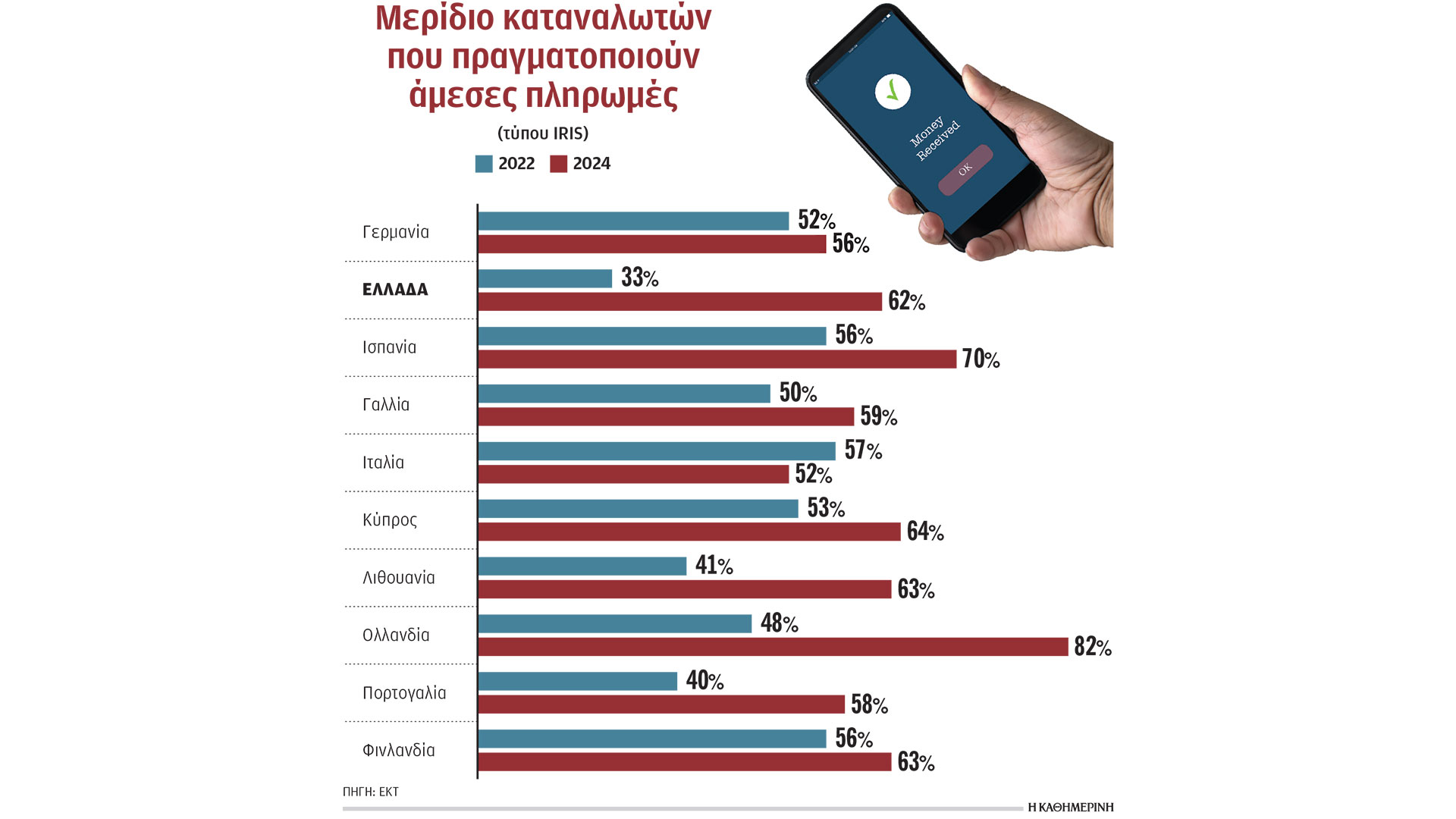 Τη δεύτερη υψηλότερη αύξηση κατά 29 ποσοστιαίες μονάδες σε ό,τι αφορά τη διαθεσιμότητα της υπηρεσίας των άμεσων πληρωμών (instant payments) από τις τράπεζες και τους παρόχους πληρωμών, καταγράφει η χώρα μας το 2024. Πρόκειται για τη δυνατότητα της μεταφοράς χρημάτων μέσα σε λίγα δευτερόλεπτα από τον λογαριασμό μας είτε για την ανταλλαγή χρημάτων μεταξύ φίλων, είτε για την πληρωμή υποχρεώσεων, όπως το ενοίκιο ή μια υπηρεσία που λάβαμε π.χ. από έναν ελεύθερο επαγγελματία ή την αγορά προϊόντων online.