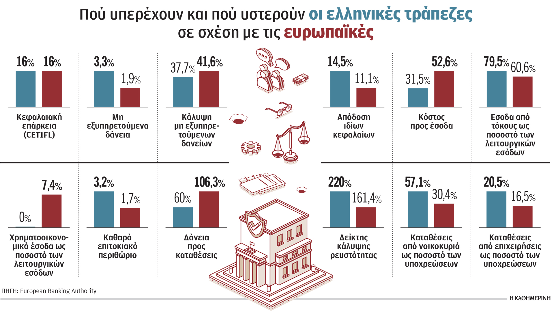 Την υπεροχή των ελληνικών τραπεζών σε πέντε βασικά σημεία, αλλά και την ανάγκη εγρήγορσης σε βασικούς τομείς της δραστηριότητάς τους δείχνει η σύγκριση των τεσσάρων συστημικών τραπεζών με τις αντίστοιχες ευρωπαϊκές, που τις φέρνει στις κορυφαίες θέσεις σε όρους λειτουργικής αποτελεσματικότητας και ρευστότητας με υψηλή επίδοση, παράλληλα στο επιτοκιακό περιθώριο και στην απόδοση των ιδίων κεφαλαίων τους.