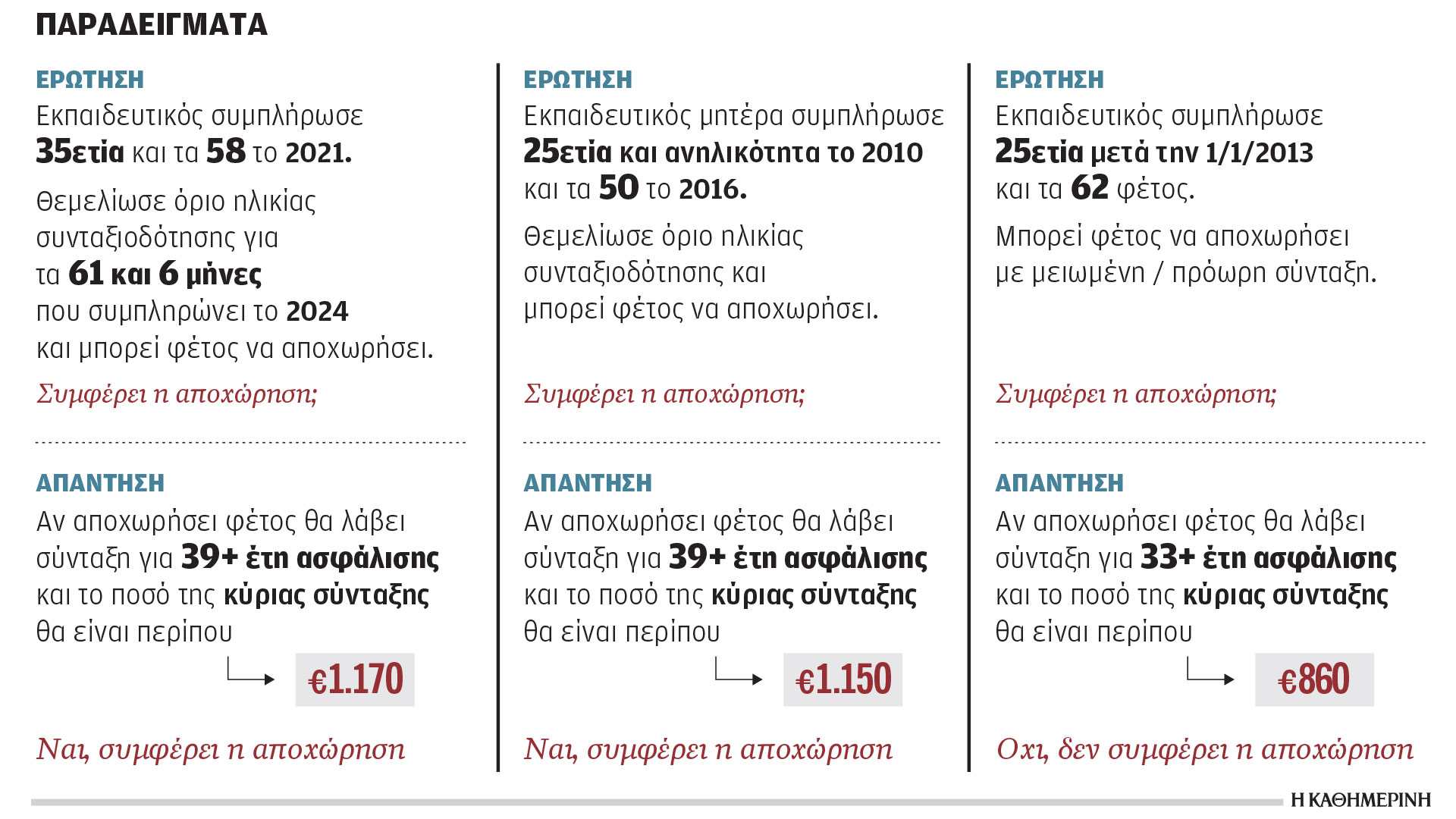 • Εκπαιδευτικοί που έχουν συμπληρώσει 37 έτη ασφάλισης μέχρι τις 31/8/2021, αλλά και ηλικία 61 ετών και 2 μηνών έως τις 31/8/2024, όπως προβλέπεται από τον ν. 4336/2015.