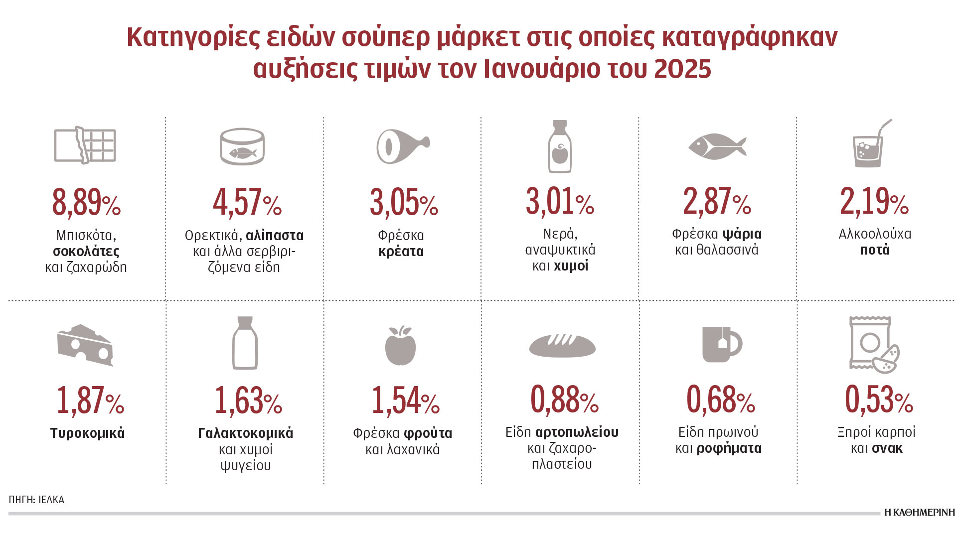 Τα πρώτα «καμπανάκια» χτύπησαν τον Ιανουάριο και όχι μόνο για το μοσχαρίσιο κρέας, καθώς σύμφωνα και με τα στοιχεία του Ινστιτούτου Ερευνας Λιανεμπορίου Καταναλωτικών Αγαθών (ΙΕΛΚΑ) από 23 κατηγορίες προϊόντων που εξετάζει, καταγράφηκαν αυξήσεις τιμών σε 13 από αυτές, όλες στα τρόφιμα, οι οποίες κυμαίνονται από 0,40% έως 8,89%.