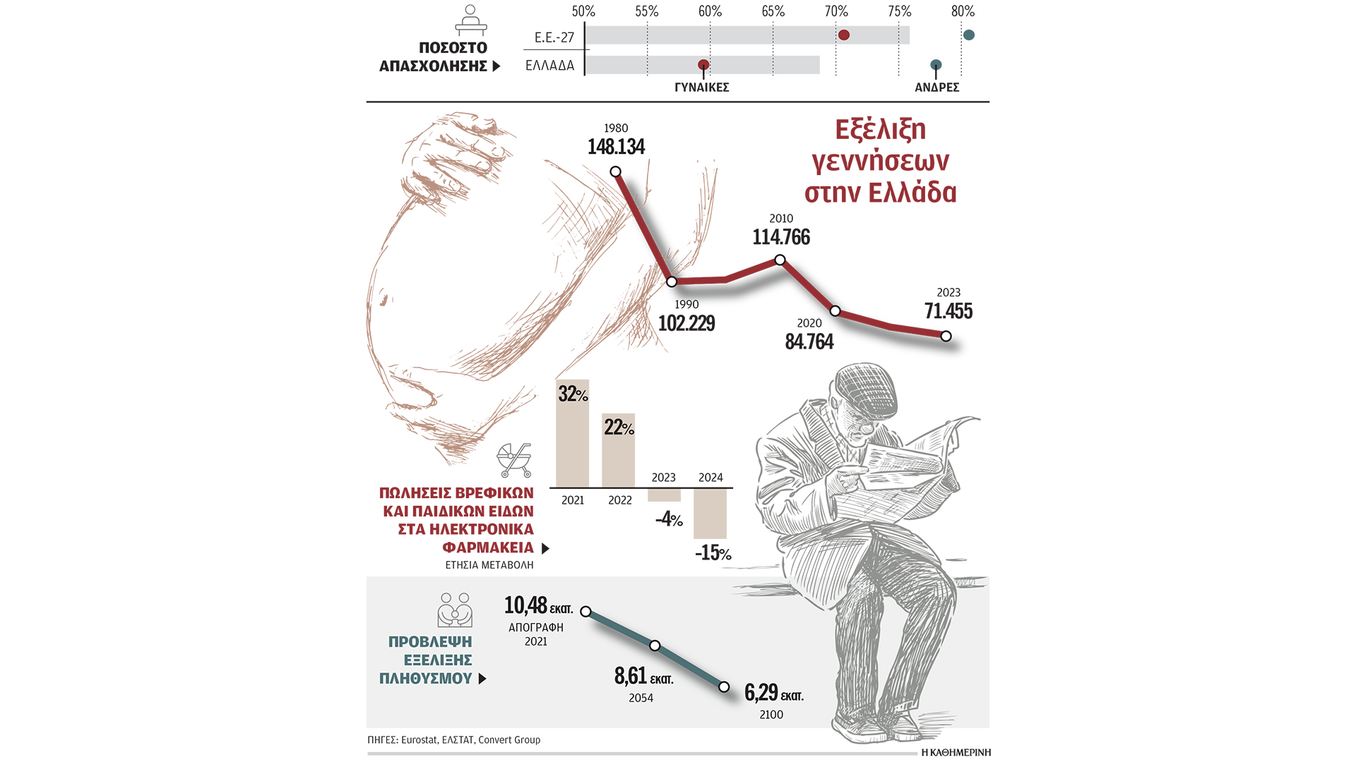 Η συμμετοχή στην αγορά εργασίας έχει, κατά γενική ομολογία, τα μεγαλύτερα περιθώρια βελτίωσης: στις ηλικίες 20-64 στην Ελλάδα είναι 69%, έναντι 75,9% στην Ε.Ε. (το δεύτερο χαμηλότερο μετά την Ιταλία). Στις γυναίκες είναι 59,8% έναντι 70,9% στην Ε.Ε. Υπάρχει μια βελτίωση σε σύγκριση με το 2022, όταν το συνολικό ποσοστό ήταν 66% και στις γυναίκες 55,3%, αλλά σίγουρα υπάρχουν κι άλλα περιθώρια.