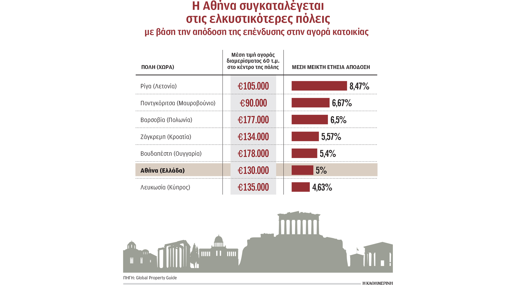 Σε πρόσφατη συγκριτική ανάλυσή της η Global Property Guide τοποθετεί την Αθήνα μεταξύ των επτά καλύτερων προορισμών στην Ευρώπη για όσους αναζητούν μια επένδυση αγοράς κατοικίας με στόχο την εκμετάλλευση. Συγκεκριμένα, το κόστος αγοράς ενός διαμερίσματος 60 τ.μ. κοστίζει περί τις 130.000 ευρώ, ποσό που καθιστά την Αθήνα την τρίτη φθηνότερη πόλη μετά την Ποντγκόριτσα του Μαυροβουνίου με 90.000 ευρώ και τη Ρίγα της Λετονίας με 105.000 ευρώ. Οσον αφορά την απόδοση (με βάση τα εισοδήματα από ενοίκια), αυτή διαμορφώνεται σε 5% (μεικτή).