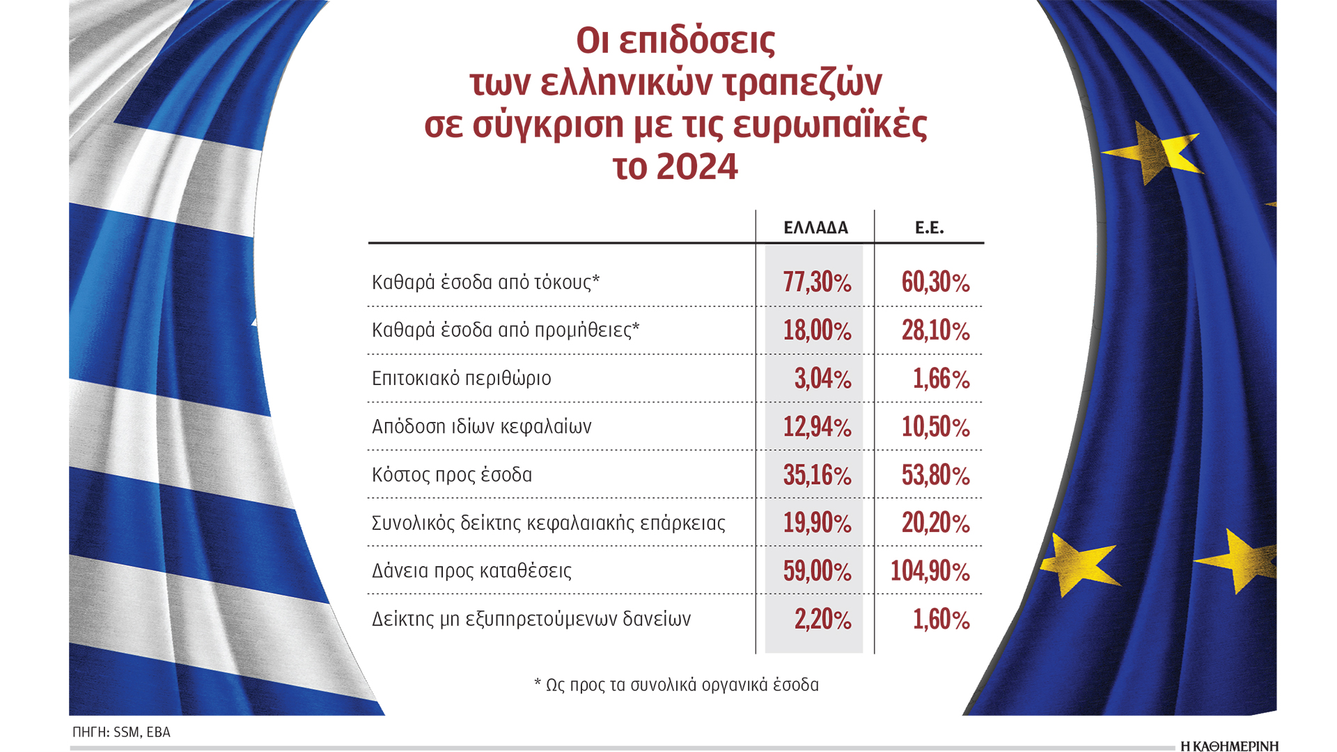 • Υψηλό επιτοκιακό περιθώριο λίγο πάνω από το 3%, που είναι σχεδόν διπλάσιο από τον μέσο όρο της Ευρωζώνης που διαμορφώθηκε στο τέλος του 2024 στο 1,6%. Οι ελληνικές τράπεζες βρέθηκαν το 2024 στην 6η θέση της κατάταξης με το υψηλότερο επιτοκιακό περιθώριο –μετά τη Σλοβενία, τη Λετονία, την Εσθονία, τη Λιθουανία και την Κύπρο– και είναι αποτέλεσμα της συγκράτησης των επιτοκίων στις καταθέσεις καθ’ όλη τη διάρκεια της ανοδικής πορείας των επιτοκίων τα δύο προηγούμενα χρόνια. Σύμφωνα με τις τράπεζες, το επιτοκιακό περιθώριο συνδέεται και με το υψηλότερο κόστος κινδύνου που χαρακτήριζε επί σειράν ετών το ελληνικό τραπεζικό σύστημα, δηλαδή τον κίνδυνο αθέτησης πληρωμών. Το κόστος κινδύνου ήταν σταθερά πολλαπλάσιο του μέσου ευρωπαϊκού όρου –το 2021 ήταν στο 5,2%– και πλέον έχει υποχωρήσει στο 0,5% που είναι ο μέσος ευρωπαϊκός όρος.