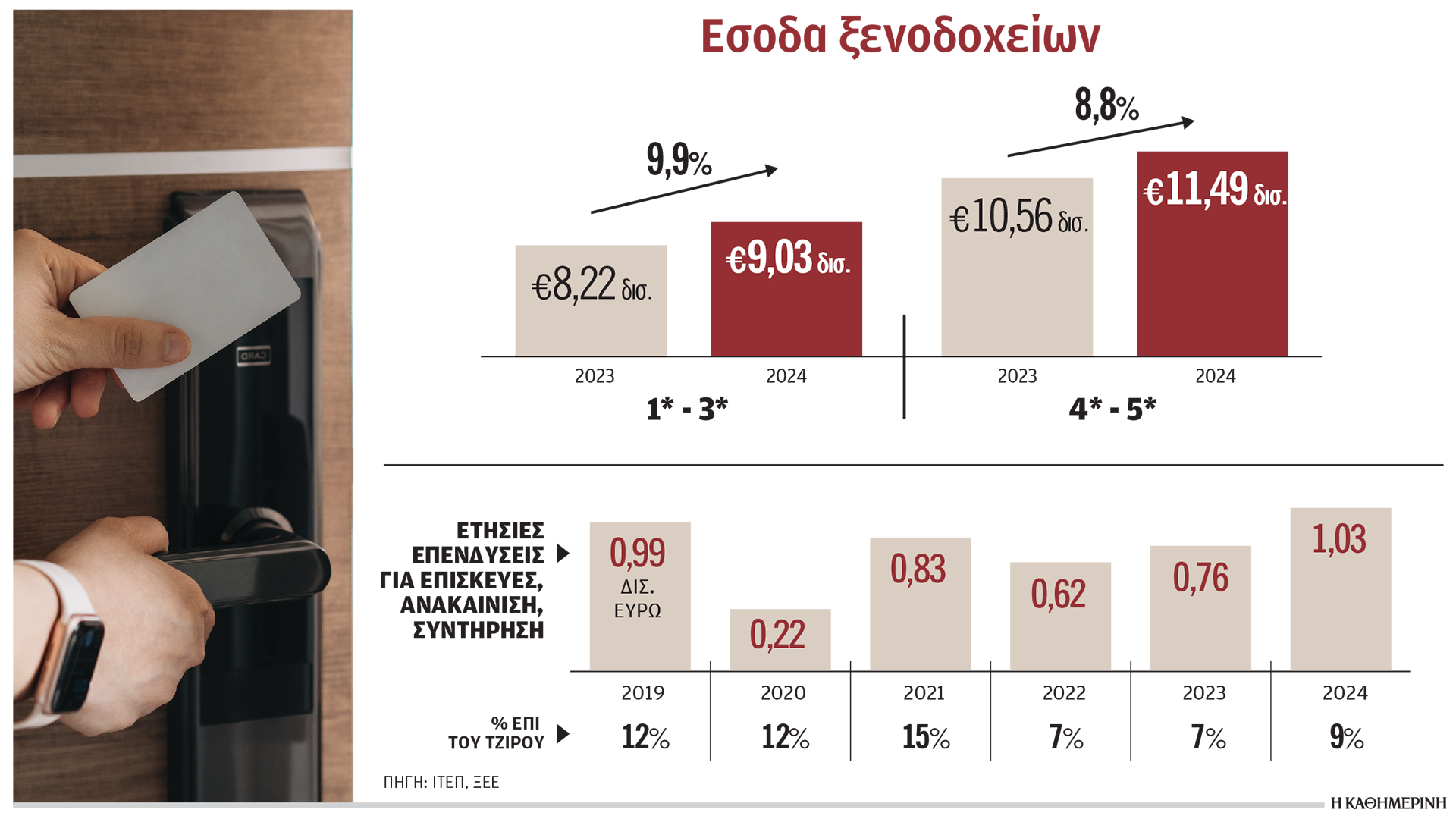Ο κύκλος εργασιών αυτός αναμένεται να αυξηθεί κατά 5%-8% περίπου, ξεπερνώντας τα 16 δισ. με βάση τις προβλέψεις για τη φετινή κίνηση. Ωστόσο, μεγάλο μέρος της αύξησης αναμένεται να προέλθει από τα καταλύματα βραχυχρόνιων μισθώσεων, καθώς οι πληρότητες στα ξενοδοχεία είναι ήδη σχετικά υψηλές και οποιαδήποτε αύξηση κύκλου εργασιών εκεί μπορεί να προέλθει μόνο από περαιτέρω αύξηση των τιμών. Τιμές που ήδη έχουν αυξηθεί σημαντικά τα τελευταία έτη. Τα παραπάνω εξηγούν στην «Κ» κύκλοι της τουριστικής βιομηχανίας, παραπέμποντας και στα στοιχεία του Ινστιτούτου Τουριστικών Ερευνών και Προβλέψεων (ΙΤΕΠ) του Ξενοδοχειακού Επιμελητηρίου Ελλάδος (ΞΕΕ), που έδειξαν αύξηση του τζίρου των ξενοδοχείων το 2024 κατά 8,8% σε σχέση με το 2023, στα 11,5 δισ.