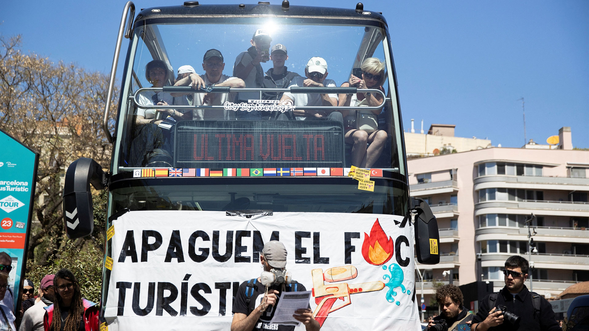Στη Βαρκελώνη, την περασμένη Κυριακή, ακτιβιστές –κάποιοι με νεροπίστολα– συγκεντρώθηκαν έξω από την εκκλησία Sagrada Familia, περικύκλωσαν ένα τουριστικό λεωφορείο γεμάτο με επιβάτες και κρέμασαν από το παρμπρίζ του ένα πανό, που προανήγγειλε τις διαμαρτυρίες της 15ης Ιουνίου.