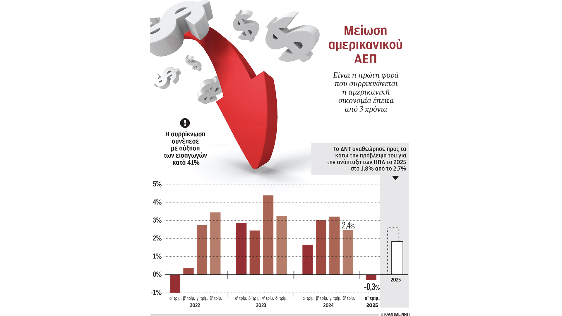 Παρά τις προς τα κάτω αναθεωρήσεις των προβλέψεων για την αμερικανική οικονομία από το ΔΝΤ, την JPMorgan και πολλούς οικονομολόγους, είναι μάλλον πρόωρο να εκτιμήσει κανείς κατά πόσον πρόκειται και μεσοπρόθεσμα να δικαιωθεί ή να διαψευσθεί ο πρόεδρος των ΗΠΑ και η ρηξικέλευθη εμπορική και οικονομική πολιτική του. Προς το παρόν για τους περισσότερους Αμερικανούς η μείωση του αμερικανικού ΑΕΠ αποτελεί όχι απλώς τη διάψευση των υποσχέσεων του Τραμπ, αλλά και την πρώτη προειδοποίηση περί του τιμήματος που θα έχει το φιλόδοξο σχέδιό του να κάνει την Αμερική και πάλι μεγάλη: του τιμήματος που θα έχουν οι δασμοί, ο εμπορικός πόλεμος ειδικότερα με την Κίνα αλλά και πολλές άλλες από τις σαρωτικές επιλογές του Ντόναλντ Τραμπ, όπως οι μαζικές απολύσεις δημοσίων υπαλλήλων και η συνεπακόλουθη επαγγελματική ανασφάλεια που ενέσπειραν αυτές οι απολύσεις σε μεγάλο ποσοστό των Αμερικανών.