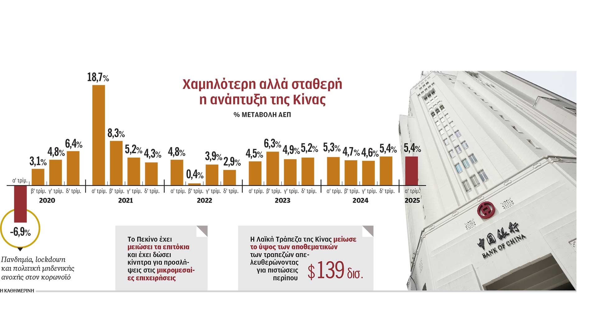 Από την αρχή της δεκαετίας, και παρά τους κραδασμούς της πανδημίας και των lockdowns, έχει δρομολογήσει τη στροφή του αναπτυξιακού μοντέλου στην εγχώρια κατανάλωση για να περιορίσει την εξάρτηση της οικονομίας από τις εξαγωγές, μολονότι εξακολουθεί να κρατάει τα σκήπτρα σε παγκόσμιο επίπεδο. Φέτος επιτάχυνε τις προσπάθειες προς αυτή την κατεύθυνση με το ειδικό σχέδιο δράσης που παρουσίασε τον Μάρτιο με σειρά μέτρων για την τόνωση της κατανάλωσης και του εσωτερικού τουρισμού. Και σύμφωνα με τα επίσημα στοιχεία, το κινεζικό τριήμερο της Πρωτομαγιάς τα ταξίδια και οι εκδρομές των Κινέζων κατέγραψαν αύξηση 6,5%, μάλλον ιδιαιτέρως σημαντική δεδομένου ότι καταγράφεται εν μέσω του πολέμου των δασμών. Εχει, άλλωστε, επανειλημμένως στηρίξει την οικονομία με μέτρα νομισματικής και δημοσιονομικής πολιτικής, με τελευταία παρέμβαση μέσα στην εβδομάδα τη μείωση των επιτοκίων και του ύψους αποθεματικών των τραπεζών.