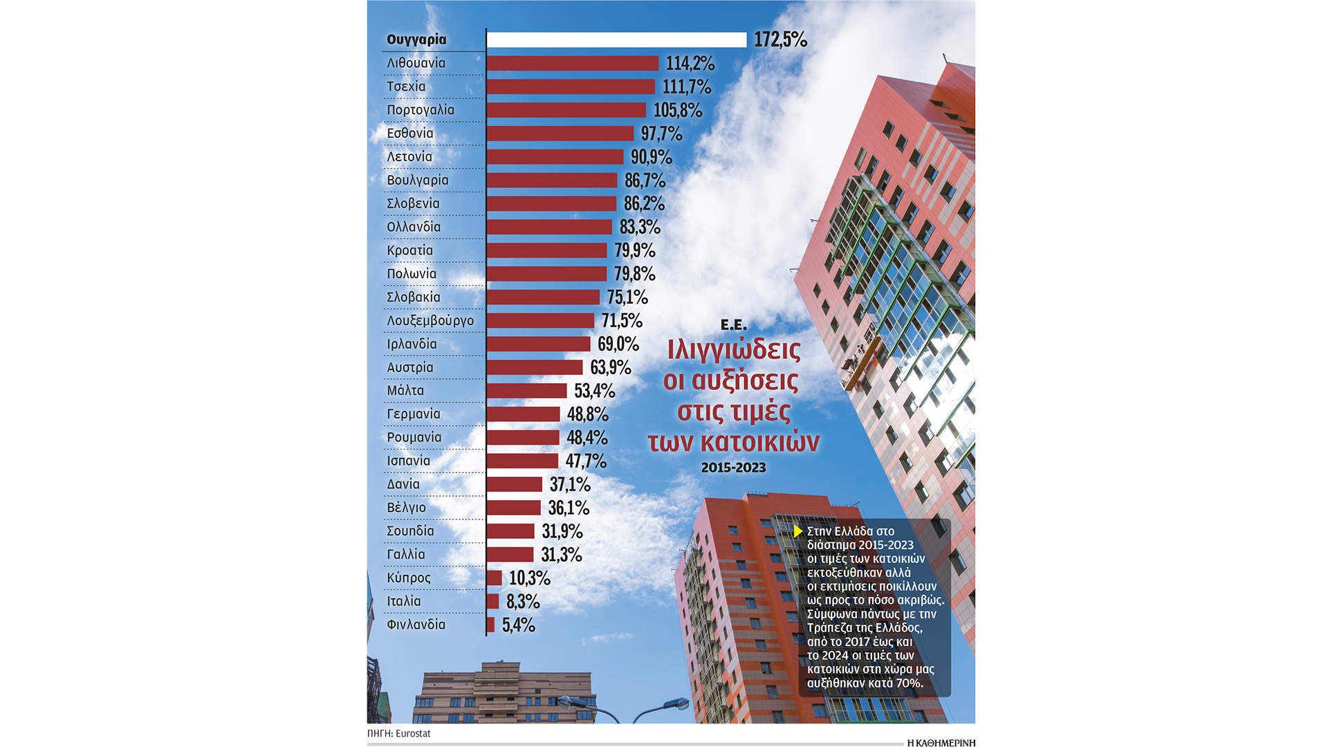 Η κατάσταση είναι παραπλήσια σε όλες τις ευρωπαϊκές χώρες, με την οικοδομική δραστηριότητα αναιμική, την προσφορά κατοικιών περιορισμένη και τη ζήτηση στα ύψη να μη βρίσκει ανταπόκριση. Εχουν, έτσι, πάρει την ανιούσα τόσο τα ενοίκια όσο και οι τιμές των κατοικιών τα τελευταία χρόνια, καθιστώντας απρόσιτο το όνειρο ενός ιδιόκτητου σπιτιού, αλλά και εφιάλτη την αναζήτηση κατοικίας για ενοικίαση. Η στεγαστική κρίση έχει εξελιχθεί σε μάστιγα οξύτερη στα μεγάλα αστικά κέντρα και ειδικότερα στις ευρωπαϊκές μητροπόλεις, που προσελκύουν εκατομμύρια τουρίστες και έχουν υποστεί την επέλαση του Airbnb με συνεπακόλουθο την εξαίρεση χιλιάδων κατοικιών από την αγορά ενοικίασης. Σύμφωνα με στοιχεία της Eurostat, το 2024 τα ενοίκια στην Ε.Ε. ήταν κατά μέσον όρον τουλάχιστον 25% υψηλότερα από τα επίπεδα του 2010, ενώ στις περισσότερες χώρες οι αυξήσεις των μισθών είναι πολύ μικρότερες. Ενδεικτική περίπτωση η Πορτογαλία, με την ακραία στεγαστική κρίση να οφείλεται ώς ένα βαθμό στην προτίμηση που της έχουν δείξει οι λεγόμενοι «ψηφιακοί νομάδες», αλλά και οι διαφόρων εθνικοτήτων πλούσιοι, όπου το ενοίκιο για ένα μικρό διαμέρισμα με μια κρεβατοκάμαρα ανέρχεται στο 63% ενός μέσου μισθού. Αλλά και η Ισπανία, όπου την τελευταία δεκαετία οι μισθοί έχουν αυξηθεί μόνο 20% ενώ το μέσο ενοίκιο έχει κυριολεκτικά διπλασιαστεί και μόνο μέσα στο 2024 αυξήθηκε περαιτέρω κατά 11%. Ετσι σύμφωνα με στοιχεία της Eurostat περισσότερα από ένα στα δέκα νοικοκυριά της Ε.Ε. δαπανούν πλέον άνω του 40% του διαθέσιμου εισοδήματός τους για τη στέγη.