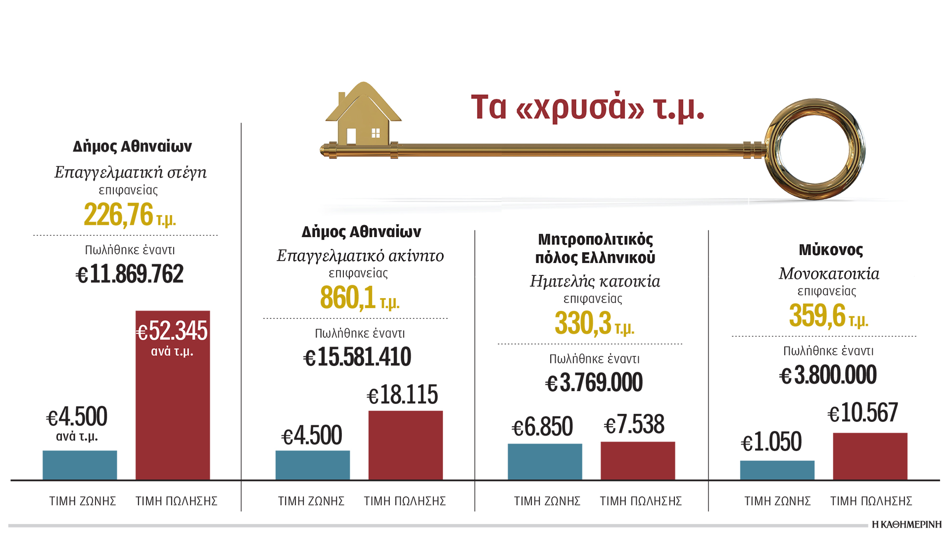 • Στη Μύκονο, μονοκατοικία 359,6 τ.μ. πωλήθηκε προς 3.800.000 ευρώ (Ιανουάριος 2025). Η τιμή ζώνης στην περιοχή ανέρχεται στα 1.050 το τ.μ. Η τιμή πώλησης έφθασε σε 10.567 ευρώ.