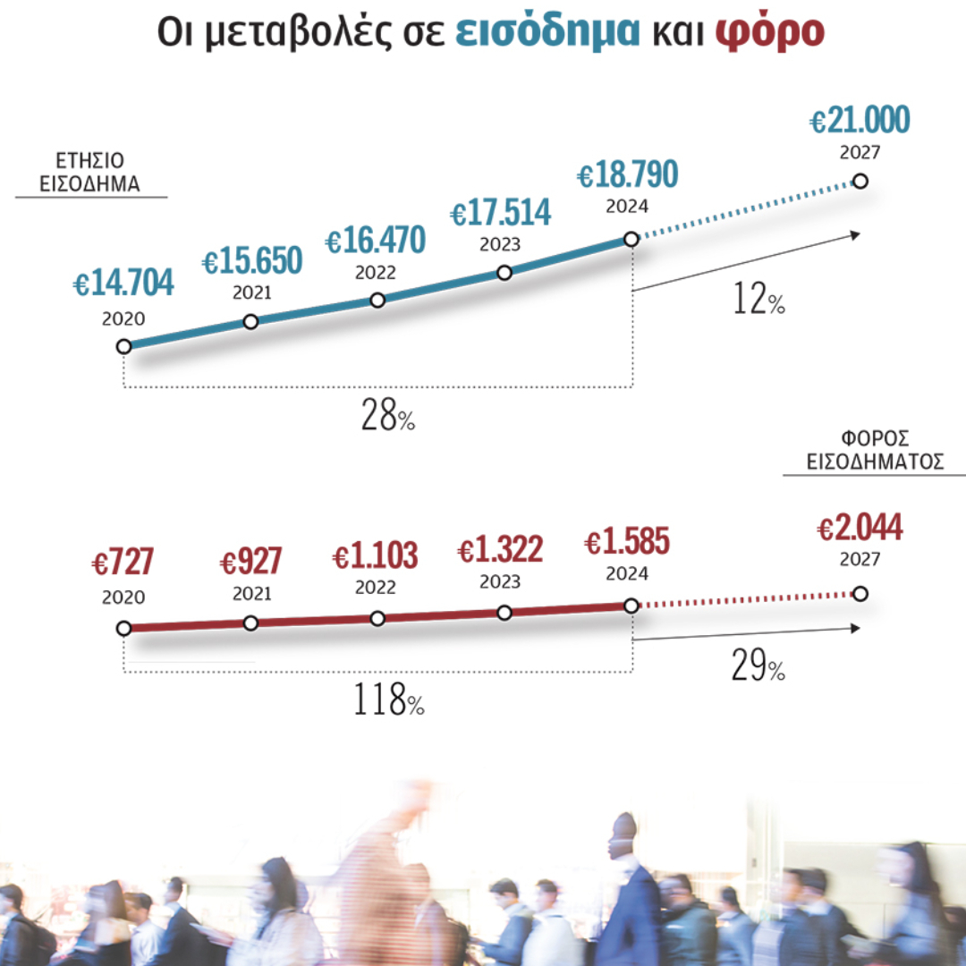 Από το 2020 μέχρι το 2024, ο μέσος μισθός στην Ελλάδα αυξήθηκε κατά 28% και στο ίδιο διάστημα, ο φόρος εισοδήματος εκτοξεύτηκε κατά 118%.