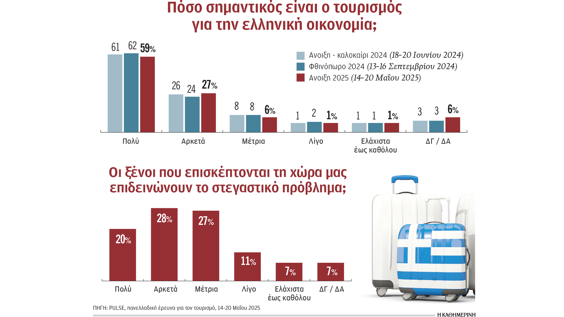 Οι εννέα στους δέκα Ελληνες πιστεύουν πως ο τουρισμός έχει θεμελιώδη σημασία για την οικονομία της χώρας, ενώ τουλάχιστον οι μισοί πιστεύουν πως οι επιλογές της όσον αφορά τον κλάδο κινούνται προς τη σωστή κατεύθυνση. Μάλιστα, το ποσοστό των Ελλήνων που θεωρεί σημαντικό τον τουρισμό για την οικονομία εμφανίζεται αυξημένο σε σχέση με προηγούμενες έρευνες. Συγκεκριμένα, το 86% τον θεωρεί από πολύ έως αρκετά σημαντικό, ενώ ένα επιπλέον 6% μέτρια σημαντικό. Επίσης, χαμηλότερα από ό,τι τα προηγούμενα χρόνια εμφανίζονται τα ποσοστά των Ελλήνων που θεωρούν πως υπάρχει πρόβλημα υπερτουρισμού. Ειδικότερα, το ποσοστό εκείνων που θεωρούν πως υπάρχει σίγουρα πρόβλημα έχει πέσει από το 29% το φθινόπωρο πέρυσι στο 21% τώρα.