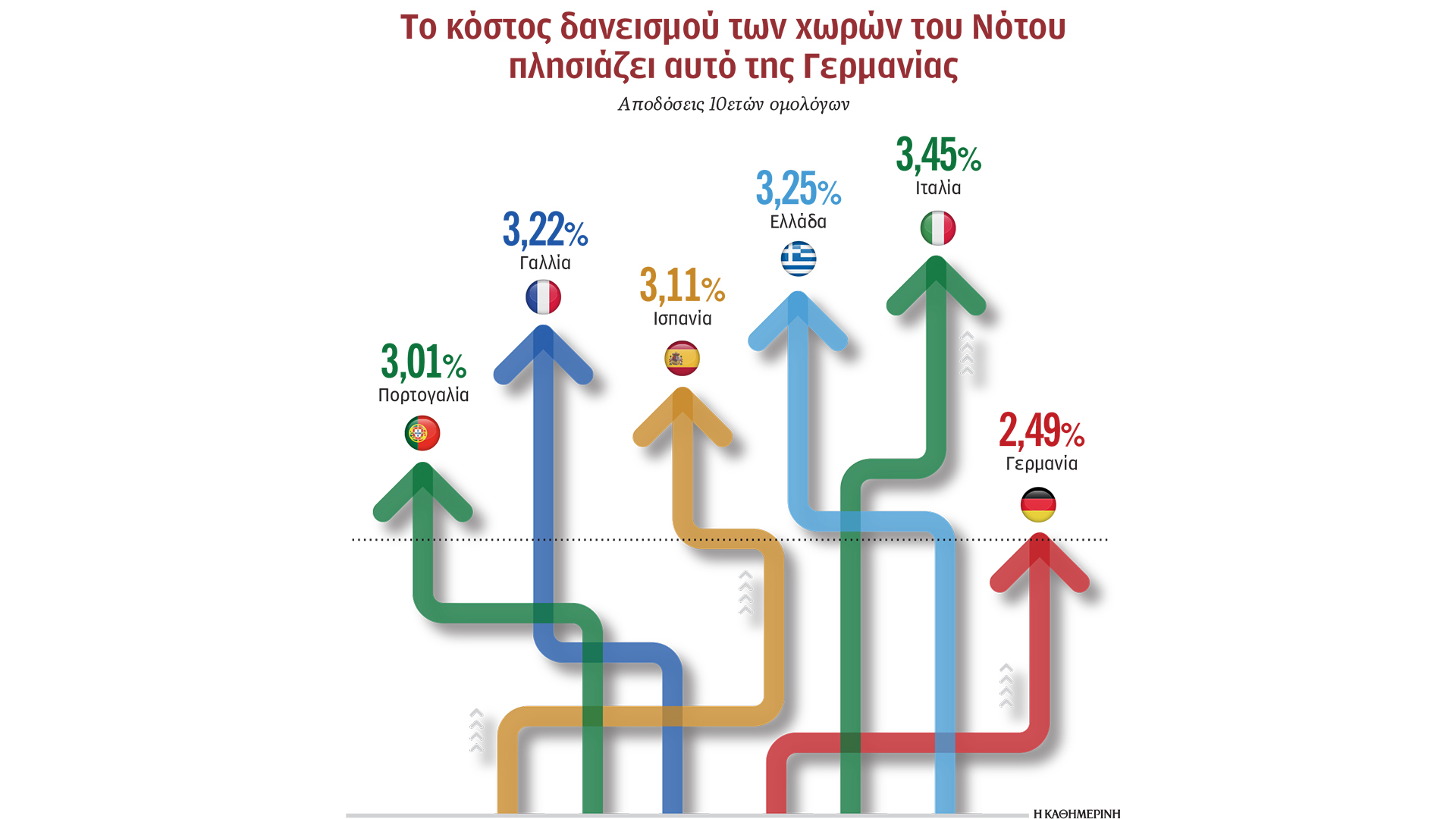 Η διαφορά της απόδοσης των 10ετών ομολόγων τους σε σχέση με τα παραδοσιακά «ασφαλή» γερμανικά 10ετή ομόλογα έχει υποχωρήσει κάτω από το 1%, όταν πριν από 10 χρόνια περίπου κινούνταν κοντά στο 6% με 7%. Το ελληνικό spread κινείται σήμερα στις 75 μονάδες βάσης και σε επίπεδα πριν από την κρίση χρέους, το ιταλικό στις 95 μ.β., το ισπανικό στις 62 μ.β. και το πορτογαλικό στις 52 μ.β. Παράλληλα, η απόδοση του ελληνικού 10ετούς η οποία διαμορφώνεται στο 3,25% είναι σχεδόν ίση με αυτή του γαλλικού 10ετούς στο 3,22%, ενώ Ισπανία και Πορτογαλία εδώ και καιρό δανείζονται πολύ φθηνότερα από το Παρίσι, και η Ιταλία, με το 10ετές της στο 3,45%, πλησιάζει επίσης.