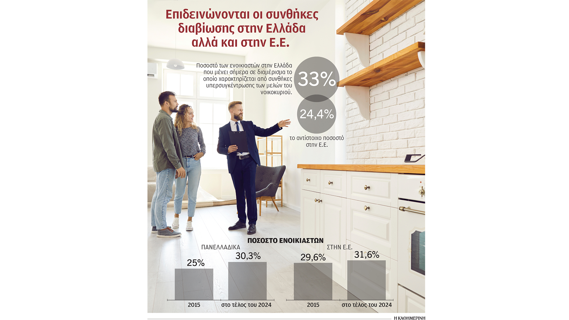 Στην Ελλάδα το αντίστοιχο ποσοστό ενοικιαστών ανέρχεται σήμερα σε 33%, δηλαδή ένας στους τρεις ενοικιαστές υποχρεούται να μένει σε σπίτι που θεωρείται μικρότερο από τις πραγματικές ανάγκες του. Το σχετικό μέγεθος είναι πρακτικά αμετάβλητο από το 2014, κάτι όμως που δεν μπορεί να είναι θετική εξέλιξη, με δεδομένη την οικονομική ανάπτυξη που έχει μεσολαβήσει και την έξοδο της οικονομίας από τη βαθιά κρίση. Το συμπέρασμα που προκύπτει από τα σχετικά στοιχεία είναι πως η αύξηση των μισθολογικών απολαβών τα τελευταία χρόνια έχει αντισταθμιστεί πλήρως από την αύξηση των ενοικίων, χωρίς να έχει καταστεί εφικτή η βελτίωση των συνθηκών διαβίωσης των νοικοκυριών.