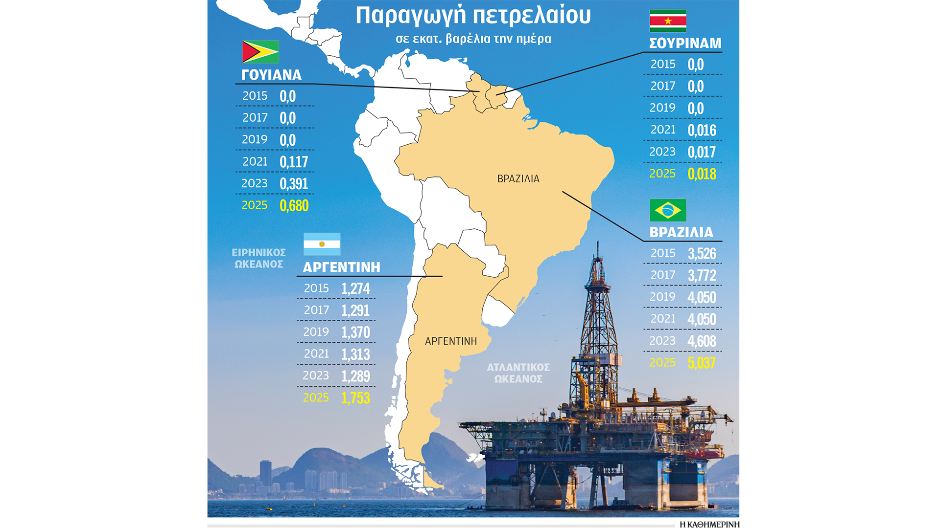 Η ανακάλυψη μετέτρεψε τη Γουιάνα στην ταχύτερα αναπτυσσόμενη οικονομία στον κόσμο, με ρυθμό αύξησης του ΑΕΠ πάνω από 40% το 2024, ενέπλεξε την Exxon σε δικαστική διαμάχη με τη Chevron, που επίσης διεκδικεί δικαιώματα στο άκρως προσοδοφόρο κοίτασμα, και έστρεψε το ενδιαφέρον των ενεργειακών κολοσσών στα πετρέλαια της Νότιας Αμερικής. Οι Shell, TotalEnergies και Chevron στράφηκαν στο γειτονικό, εξίσου μικρό και εξίσου φτωχό, Σουρινάμ, με επενδύσεις που εκτοξεύθηκαν από τα 348 εκατ. δολ. το 2020 στα 514 εκατ. δολ. το περασμένο έτος. Σύμφωνα με τη συμβουλευτική Rystad Energy, το 2025 και το 2026 θα γίνονται εξορύξεις σε τουλάχιστον 10 πετρελαιοπηγές του Σουρινάμ, ενώ από φέτος και μέχρι το 2027 οι επενδύσεις εκεί θα εκτοξευθούν στα 9,5 δισ. δολ. Οι Exxon και Chevron επενδύουν παράλληλα σε Βραζιλία και Αργεντινή, και εκτιμάται πως σε συνδυασμό με τη Γουιάνα οι τρεις χώρες θα αντιπροσωπεύουν σύντομα το 80% της αύξησης στην παραγωγή πετρελαίου παγκοσμίως. Παράλληλα, η κρατική πετρελαϊκή της Βραζιλίας, Petrobras, σχεδιάζει να επενδύσει 111 δισ. δολ. σε σχέδια πετρελαίου, ενώ στην Αργεντινή η παραγωγή πετρελαίου είναι στα υψηλά 20ετίας. Και το Μεξικό σχεδιάζει να αυξήσει τη δική του παραγωγή σε σχιστολιθικούς υδρογονάνθρακες με τις ευλογίες της προέδρου Κλαούντια Σέινμπαουμ, που ως περιβαλλοντολόγος θα όφειλε να έχει αντιρρήσεις, καθώς η υδραυλική ρηγμάτωση είναι επιζήμια για το περιβάλλον.