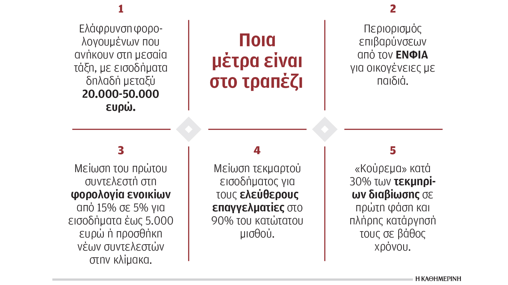 1. Αλλαγές στην κλίμακα φορολογίας εισοδήματος των φυσικών προσώπων με στόχο την ελάφρυνση των φορολογουμένων που ανήκουν στη λεγόμενη μεσαία τάξη, με εισοδήματα δηλαδή μεταξύ 20.000-50.000 ευρώ. Στο πλαίσιο αυτό εξετάζονται: