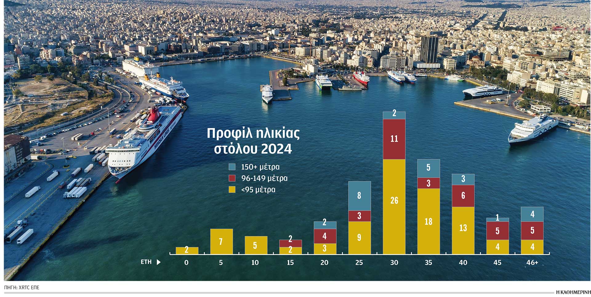 Ο ακτοπλοϊκός στόλος της χώρας, με 153 πλοία που εξυπηρετούν 120 νησιά, ανήκει σε 33 επιχειρήσεις. Πολλά από τα πλοία βρίσκονται κοντά στο τέλος του κύκλου ζωής τους, καθιστώντας επιτακτική την αναδιάρθρωση του στόλου, ώστε να ανταποκρίνεται στους νέους περιβαλλοντικούς κανονισμούς της Ε.Ε. Σύμφωνα με την ετήσια έρευνα για τον κλάδο της XRTC Business Consultants, εταιρεία συμβούλων που ειδικεύεται στις θαλάσσιες μεταφορές, ο μέσος όρος ηλικίας των πλοίων σήμερα αγγίζει τα 30 έτη έναντι των 24 ετών του ευρωπαϊκού ακτοπλοϊκού στόλου, ενώ μόνο το 17% του ελληνικού στόλου είναι κάτω των 20 ετών. Τα 45 από τα 153 πλοία, το 29% δηλαδή του ελληνικού ακτοπλοϊκού στόλου, είναι ηλικίας 40 ετών και άνω.