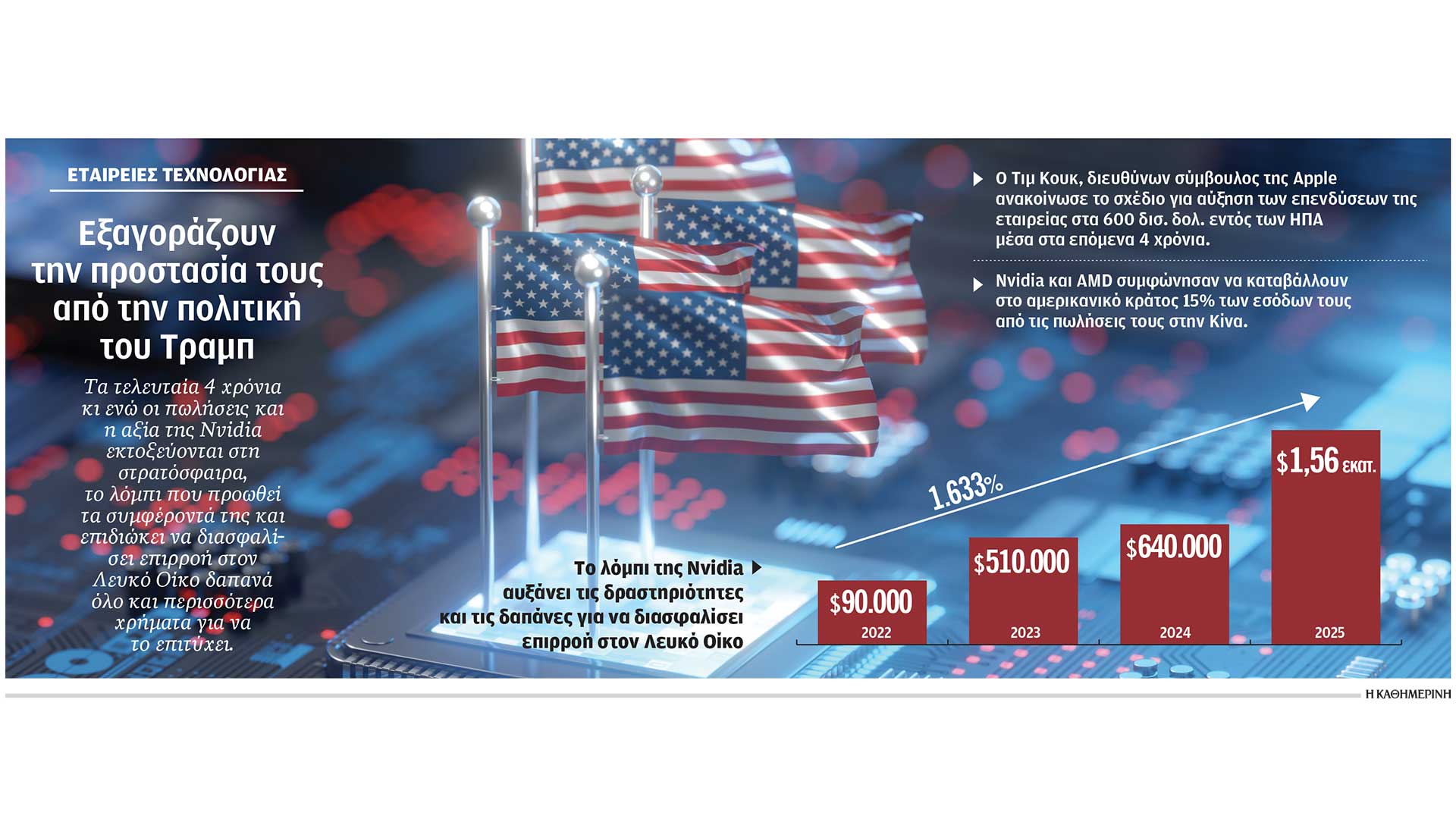 Ο λόγος για τη συμφωνία με τον κολοσσό των μικροεπεξεργαστών, τη Nvidia, και παράλληλα με την αντίστοιχη της Advanced Micro Devices (AMD), στις οποίες επέτρεψε να εξάγουν τους μικροεπεξεργαστές τους τεχνητής νοημοσύνης στην Κίνα έναντι αδράς αμοιβής στο αμερικανικό κράτος, την καταβολή του 15% των εσόδων τους από τις συγκεκριμένες πωλήσεις. Οπως προκύπτει από τις πηγές μεγάλων αμερικανικών εφημερίδων, ο Τραμπ ζήτησε αρχικά φόρο 20% από τον διευθύνοντα σύμβουλο της Nvidia, Τζένσεν Χουάνγκ, στο μεταξύ τους παζάρι στον Λευκό Οίκο.