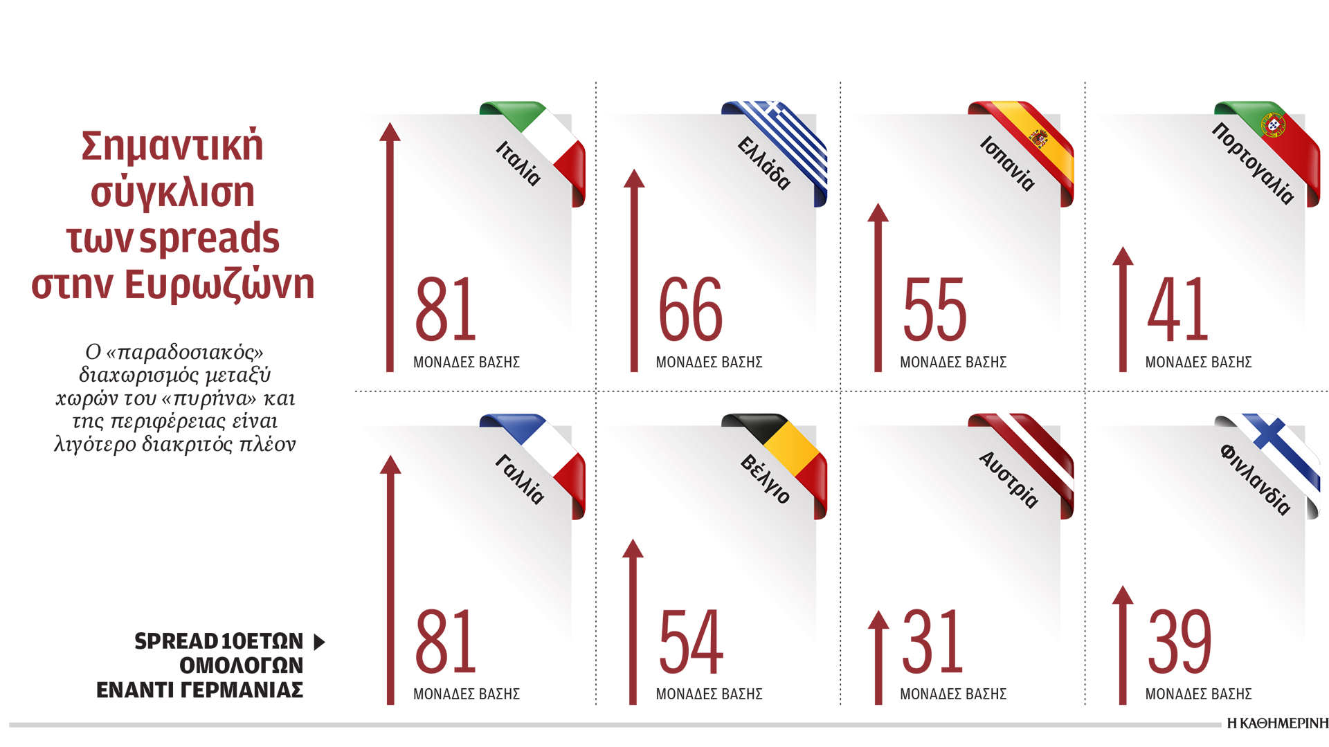 «Η σύγκλιση των spreads οφείλεται σε μεγάλο βαθμό στις γνήσιες μακροοικονομικές βελτιώσεις της περιφέρειας και στη βελτίωση των συνθηκών της αγοράς. Πιστεύουμε ότι και μακροπρόθεσμα τα spreads θα παραμείνουν πολύ χαμηλότερα από αυτά που παρατηρήθηκαν τα τελευταία 15 χρόνια», σχολιάζει στην «Κ» και ο οικονομολόγος της Oxford Economics Πάολο Γκρινιάνι. Κατά την Oxford Economics, μάλιστα, η Γαλλία αναμένεται να είναι η μόνη χώρα στην Ευρωζώνη της οποίας τα δημοσιονομικά θα επιδεινωθούν σημαντικά μακροπρόθεσμα.