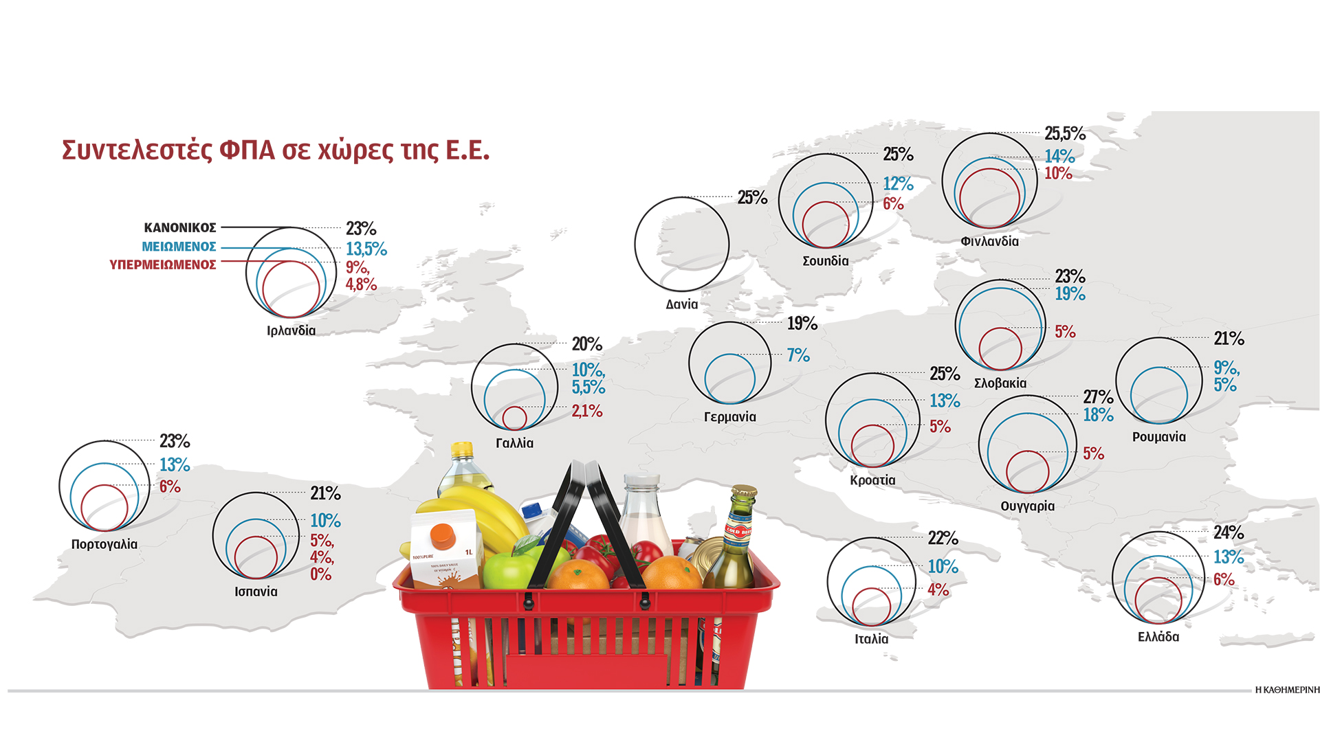 Το σίγουρο είναι ότι η Ελλάδα έχει από τους υψηλότερους συντελεστές στην Ευρώπη και από τις υψηλότερες αναλογίες εσόδων από έμμεσους έναντι των άμεσων φόρων. Η μεγάλη αύξηση των συντελεστών ΦΠΑ, εξάλλου, υπήρξε μνημονιακό απότοκο: Οι συντελεστές 9% και 19% του 2010 έγιναν 13% και 24% για να μειώσουν το έλλειμμα. Λογικά, κάποια στιγμή μπορεί να αναμένεται κάποια εξισορρόπηση.