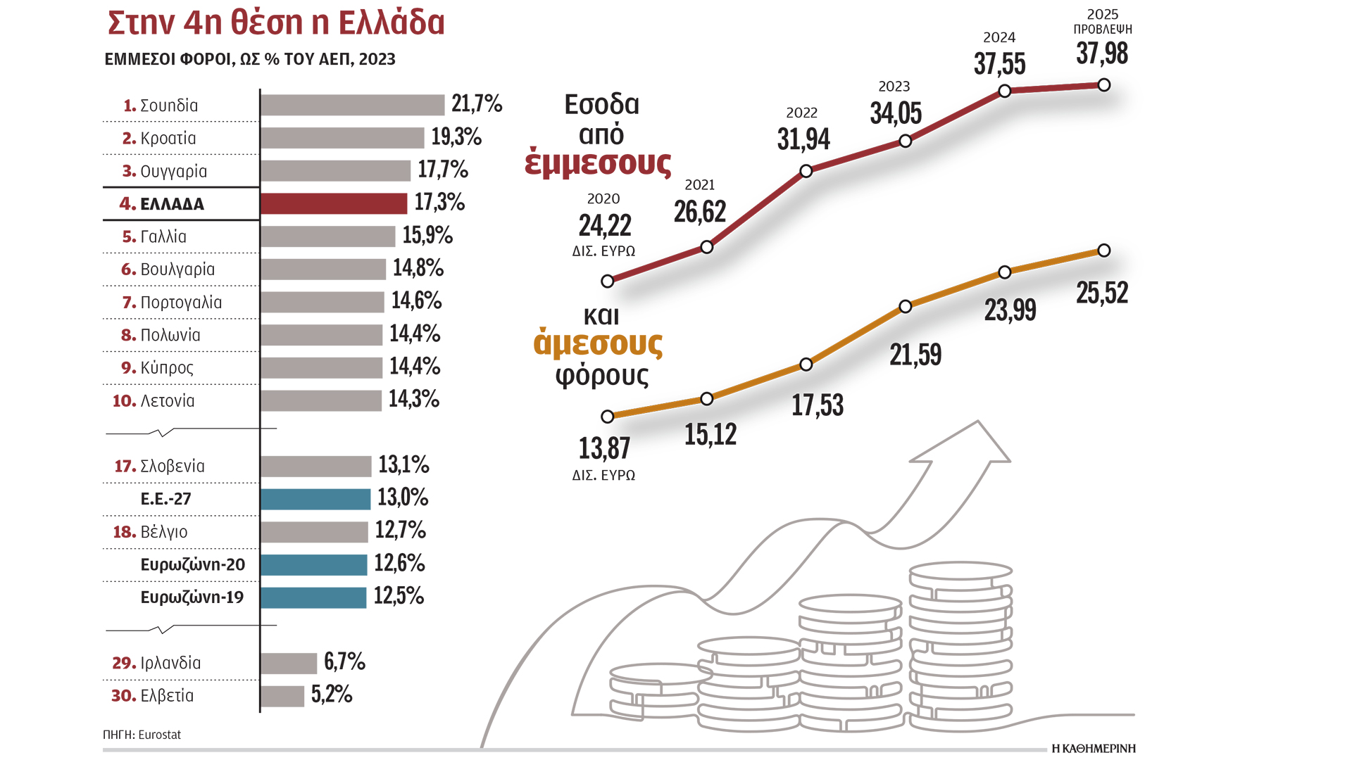 Σύμφωνα με τα στοιχεία των προϋπολογισμών του κράτους, από το 2020 έως σήμερα, τα έσοδα από έμμεσους φόρους στην Ελλάδα έχουν αυξηθεί κατά περίπου 14 δισ. ευρώ. Από 24,2 δισ. ευρώ το 2020 εκτιμάται ότι θα φτάσουν και κατά πάσα πιθανότητα θα ξεπεράσουν τα 38 δισ. ευρώ φέτος.