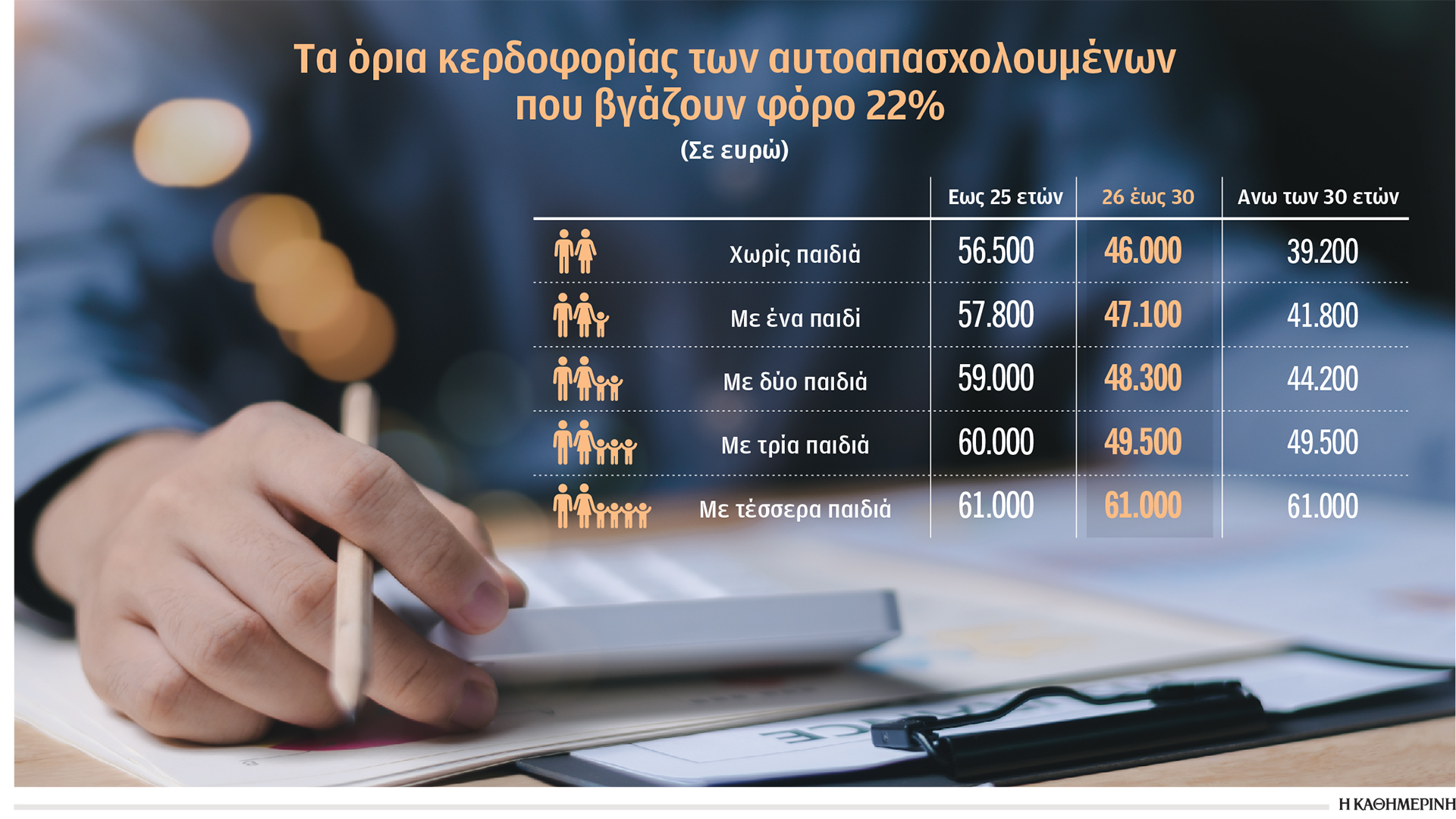 Μέχρι και φέτος οι ενδιαφερόμενοι, ανεξαρτήτως ηλικίας ή οικογενειακής κατάστασης, γνώριζαν ότι αν τα καθαρά κέρδη τους είναι μεγαλύτερα των 35.000 ευρώ, θα έπρεπε να εξετάσουν το ενδεχόμενο σύστασης μιας προσωπικής (ομόρρυθμης ή ετερόρρυθμης) εταιρείας ή κάποιου νομικού προσώπου (συνήθως ΙΚΕ, που έχει γίνει και ιδιαίτερα δημοφιλής ως λύση). Γιατί 35.000 ευρώ; Διότι με την κλίμακα φυσικών προσώπων αυτό ήταν το όριο κερδοφορίας πάνω από το οποίο ο πραγματικός φορολογικός συντελεστής (σ.σ. δηλαδή το ποσό του φόρου εισοδήματος προς το σύνολο των κερδών) ξεπερνούσε το 22%, που είναι και ο συντελεστής φορολόγησης των νομικών προσώπων. Από τη χρήση του 2026 δεν θα υπάρχει ένα ενιαίο ποσό για όλους, αλλά αυτό θα διαφοροποιείται ανάλογα και με την ηλικία και με τον αριθμό των παιδιών εξαιτίας των «καινοτομιών» που εισάγονται στη φορολογική κλίμακα. Ετσι: