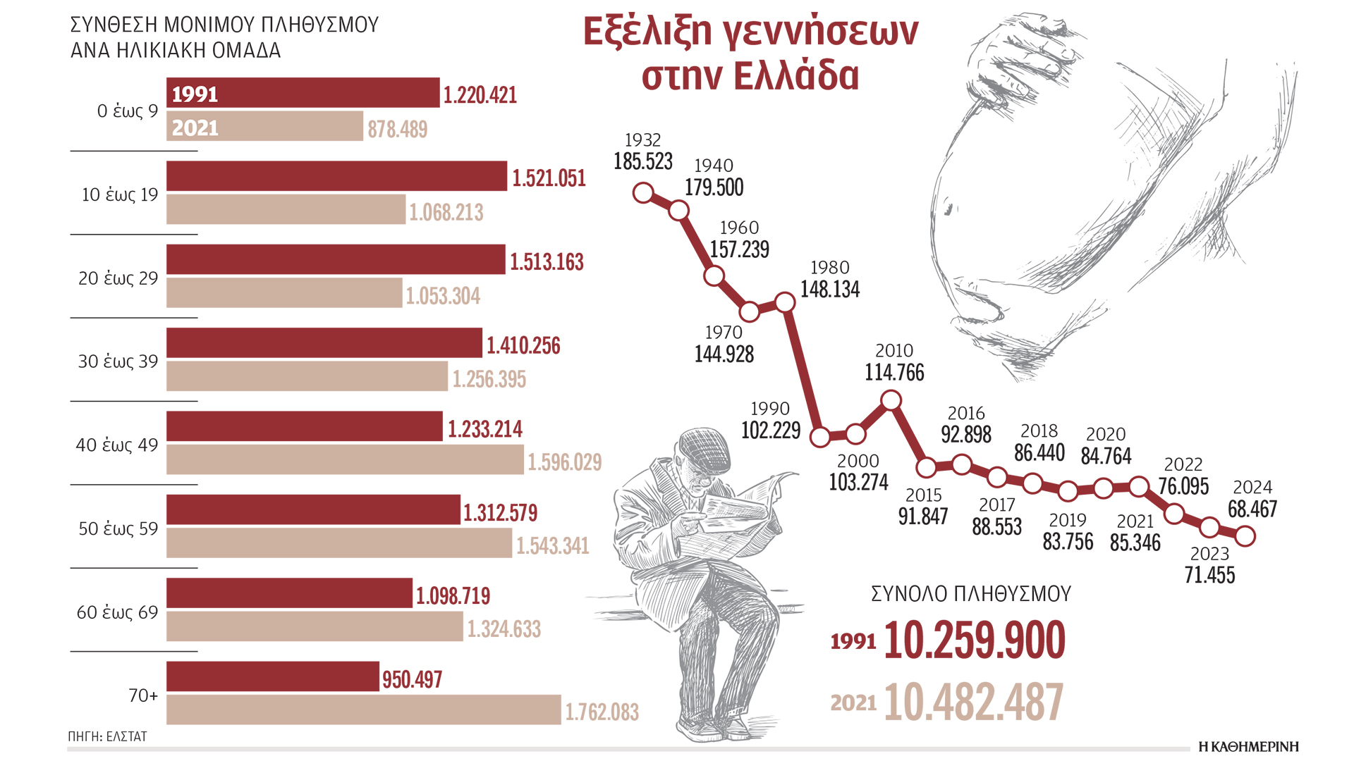 Το 2024 καταγράφηκε νέο ιστορικό χαμηλό στις γεννήσεις παιδιών στην Ελλάδα, οι οποίες υποχώρησαν για πρώτη φορά κάτω και από τις 70.000 και διαμορφώθηκαν στις 68.467.