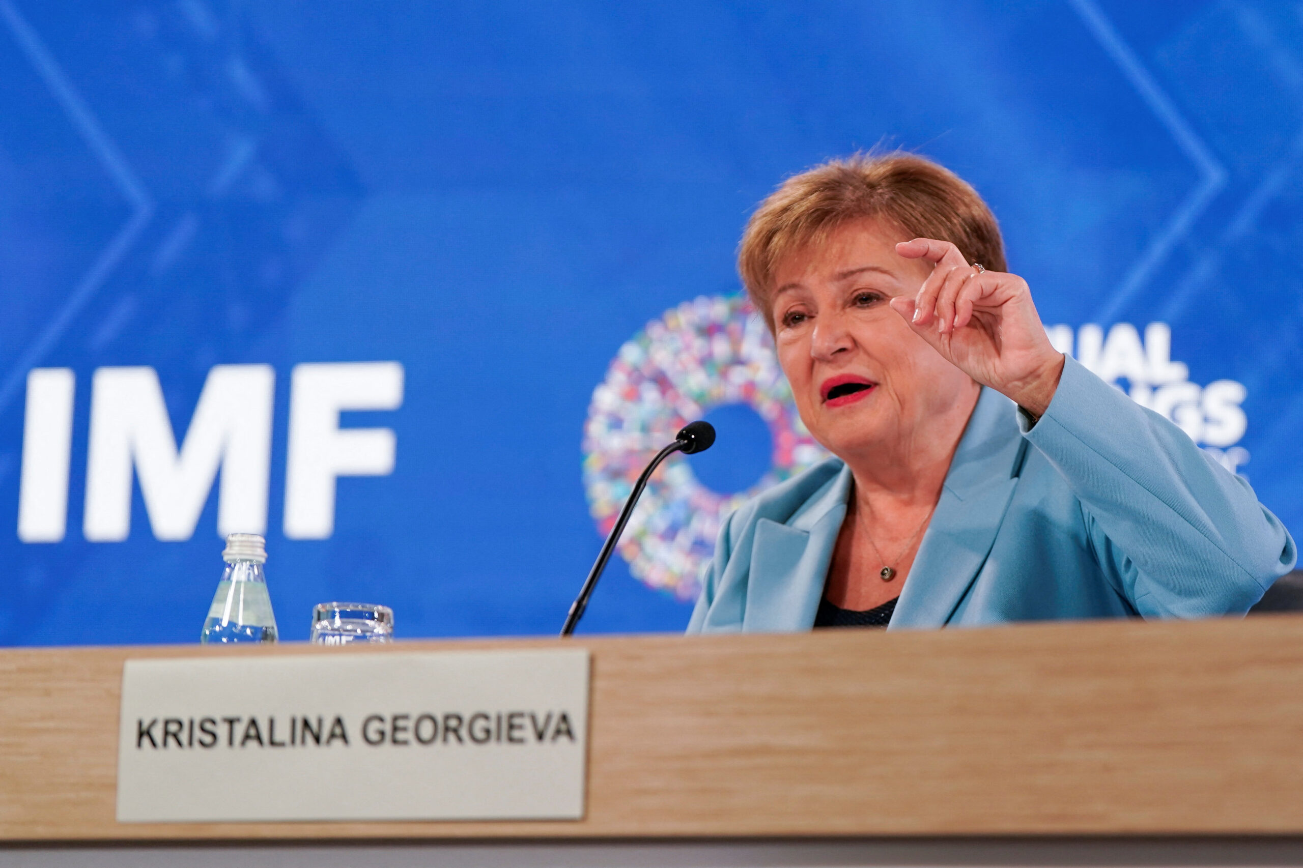 Μιλώντας σε συνέντευξη Τύπου στο περιθώριο των ετήσιων συνεδριάσεων του ΔΝΤ και της Παγκόσμιας Τράπεζας στην Ουάσιγκτον, η Γκεοργκίεβα δήλωσε ότι η παγκόσμια οικονομία «παραμένει υπερβολικά ανισόρροπη», προτρέποντας τις χώρες με μεγάλα εξωτερικά πλεονάσματα, όπως η Κίνα, να στηρίξουν περισσότερο την εγχώρια κατανάλωση, και τις χώρες με υψηλά δημοσιονομικά ελλείμματα, όπως οι Ηνωμένες Πολιτείες, να τα περιορίσουν.
