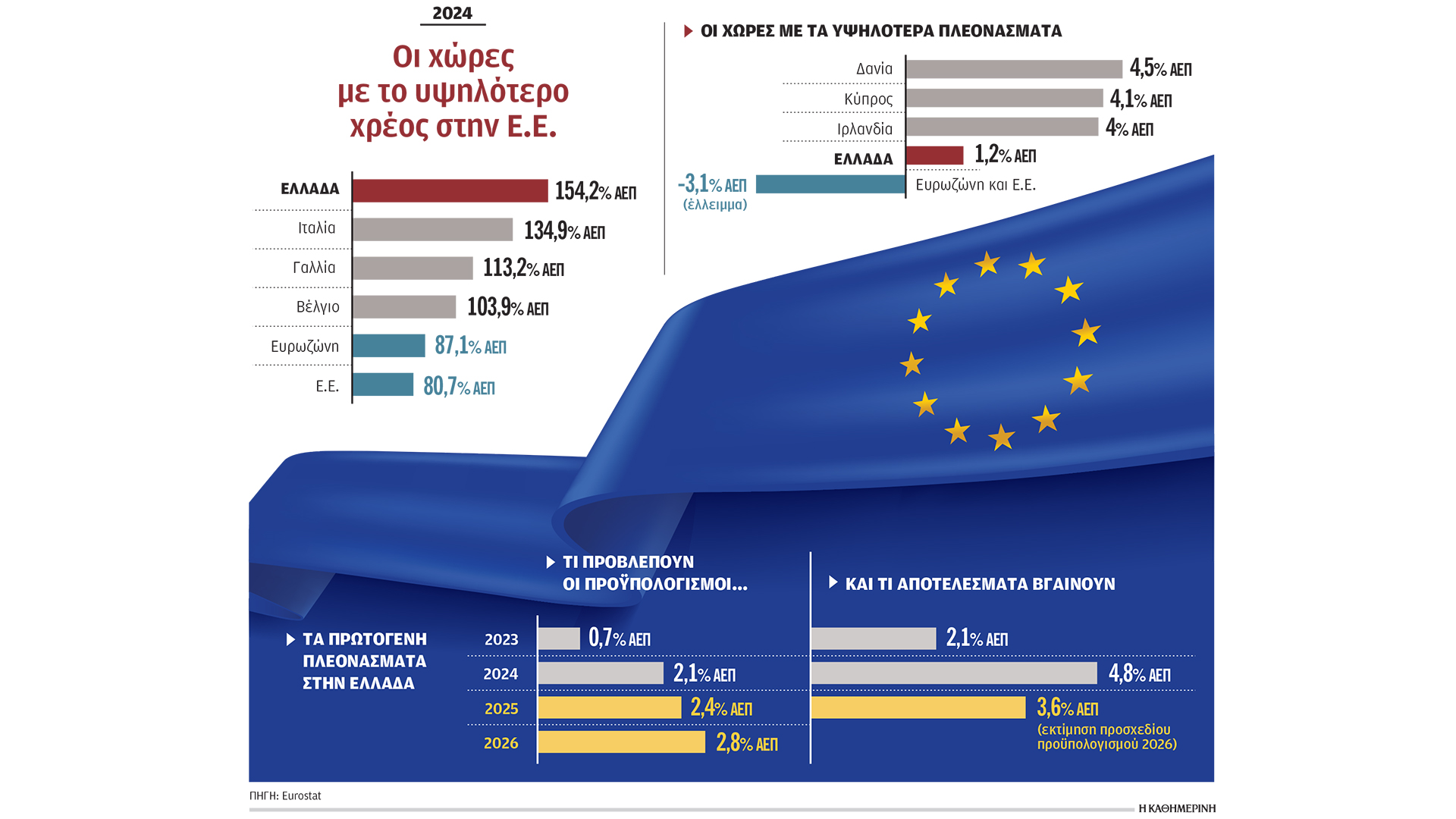 Τα τελευταία χρόνια η Ελλάδα, όχι μόνο έχει σταθερά θετικό δημοσιονομικό ισοζύγιο και πρωτογενή πλεονάσματα, αλλά υπερβαίνει συστηματικά τον στόχο του εκάστοτε προϋπολογισμού. Το 2024, μάλιστα, η υπέρβαση ήταν εντυπωσιακή: από πρωτογενές πλεόνασμα 2,1% του ΑΕΠ που προέβλεπε ο προϋπολογισμός του έτους, έφτασε στο 4,8% του ΑΕΠ. Για φέτος ο στόχος έχει ήδη αναθεωρηθεί από πρωτογενές πλεόνασμα 2,4% του ΑΕΠ, που προέβλεπε ο προϋπολογισμός 2025 σε 3,6% του ΑΕΠ, σύμφωνα με το προσχέδιο προϋπολογισμού 2026. Εχουν διατυπωθεί εκτιμήσεις ότι μπορεί να φτάσει τελικά και στο 4% του ΑΕΠ, αλλά αυτό θα φανεί την επόμενη χρονιά.