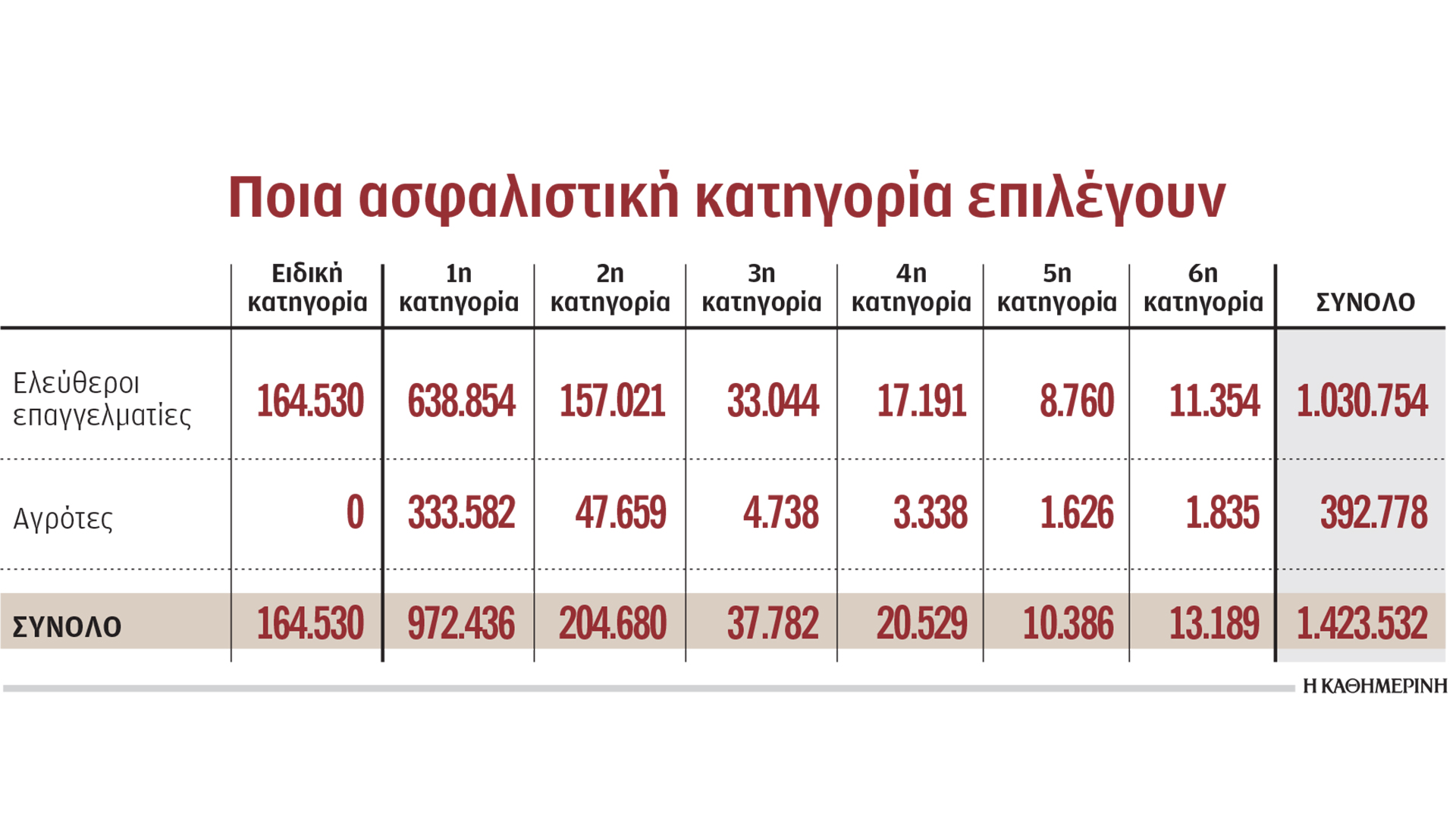 Τα επίσημα στατιστικά στοιχεία του e-ΕΦΚΑ –τα τελευταία αφορούν τον Μάρτιο του 2025– αποδεικνύουν ότι, τουλάχιστον στις τάξεις των αυτοαπασχολουμένων, η επιλογή της ασφαλιστικής κατηγορίας γίνεται με κριτήριο τις σημερινές και όχι τις μελλοντικές ανάγκες. Σε σύνολο 1,4 εκατ. αυτοαπασχολούμενων, οι 164.530 επιλέγουν την ειδική (είναι η χαμηλότερη) κατηγορία, ενώ οι 972.436 προτιμούν την 1η, που περιορίζει τη μηνιαία επιβάρυνση περίπου στα 250 ευρώ. Δηλαδή, οι 8 στους 10 επιλέγουν το «φθηνότερο δυνατό». Πώς λειτουργεί στην πράξη αυτή η επιλογή; Από τα 244,65 ευρώ που πληρώνουν κάθε μήνα όσοι εγγράφονται στην 1η κατηγορία, μόλις τα 180,65 ευρώ πηγαίνουν για τη σύνταξη και τα υπόλοιπα 64 ευρώ για τις εισφορές υγείας. Αυτό το ποσό των 180,65 ευρώ πολλαπλασιάζεται επί πέντε και βγάζει τον συντάξιμο μισθό των 905 ευρώ. Με τόσο χαμηλό συντάξιμο μισθό είναι πολύ δύσκολο να ανέβει η σύνταξη ψηλά. Ενα παράδειγμα: Με 30 χρόνια ασφάλισης, ο συντελεστής αναπλήρωσης (είναι αυτό που πολλαπλασιάζεται με τον συντάξιμο μισθό για να βγει το αναλογικό κομμάτι της σύνταξης) δεν ξεπερνά το 26,5%. Ετσι, ακόμη και αν συνυπολογιστεί η εθνική σύνταξη, το ποσό που θα απομείνει στην τσέπη του επαγγελματία όταν θα συνταξιοδοτηθεί δεν θα υπερβαίνει τα 600 ευρώ καθαρά.