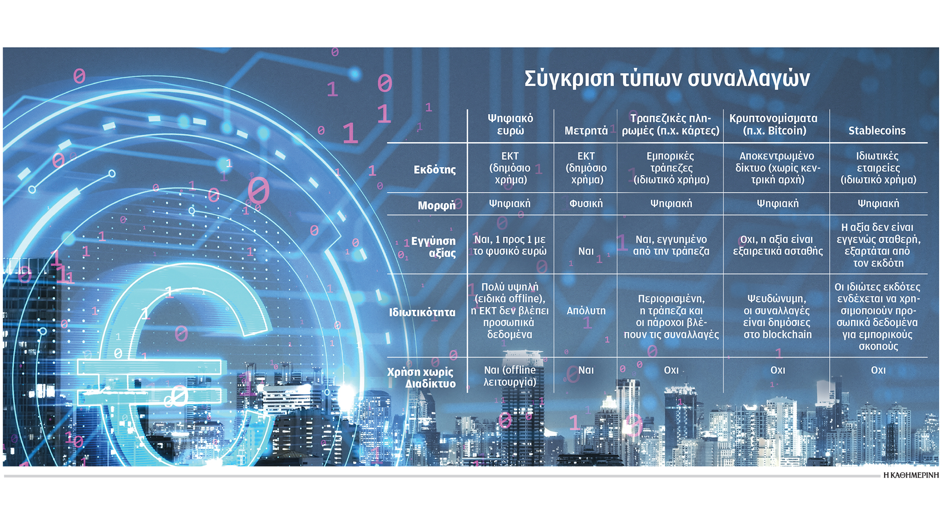 Το ψηφιακό ευρώ δεν θα είναι ένα νέο νόμισμα, αλλά μια νέα μορφή νομίσματος. Φανταστείτε το σαν ένα δημόσιο Paypal, με τη διαφορά ότι οι πληρωμές θα υποστηρίζονται από την κεντρική τράπεζα και, ως εκ τούτου, θα είναι 100% ασφαλείς. Επιπλέον, η ΕΚΤ δεν θα έχει πρόσβαση στις λεπτομέρειες των συναλλαγών των πολιτών. Η καινοτομία του ψηφιακού ευρώ είναι ότι θα λειτουργεί τόσο online όσο και offline, θα μπορεί δηλαδή κάποιος να συναλλάσσεται ακόμα κι όταν δεν υπάρχει σύνδεση στο Διαδίκτυο, ή σε περιπτώσεις γενικευμένης διακοπής ρεύματος, όπως ακριβώς συμβαίνει με τα μετρητά.