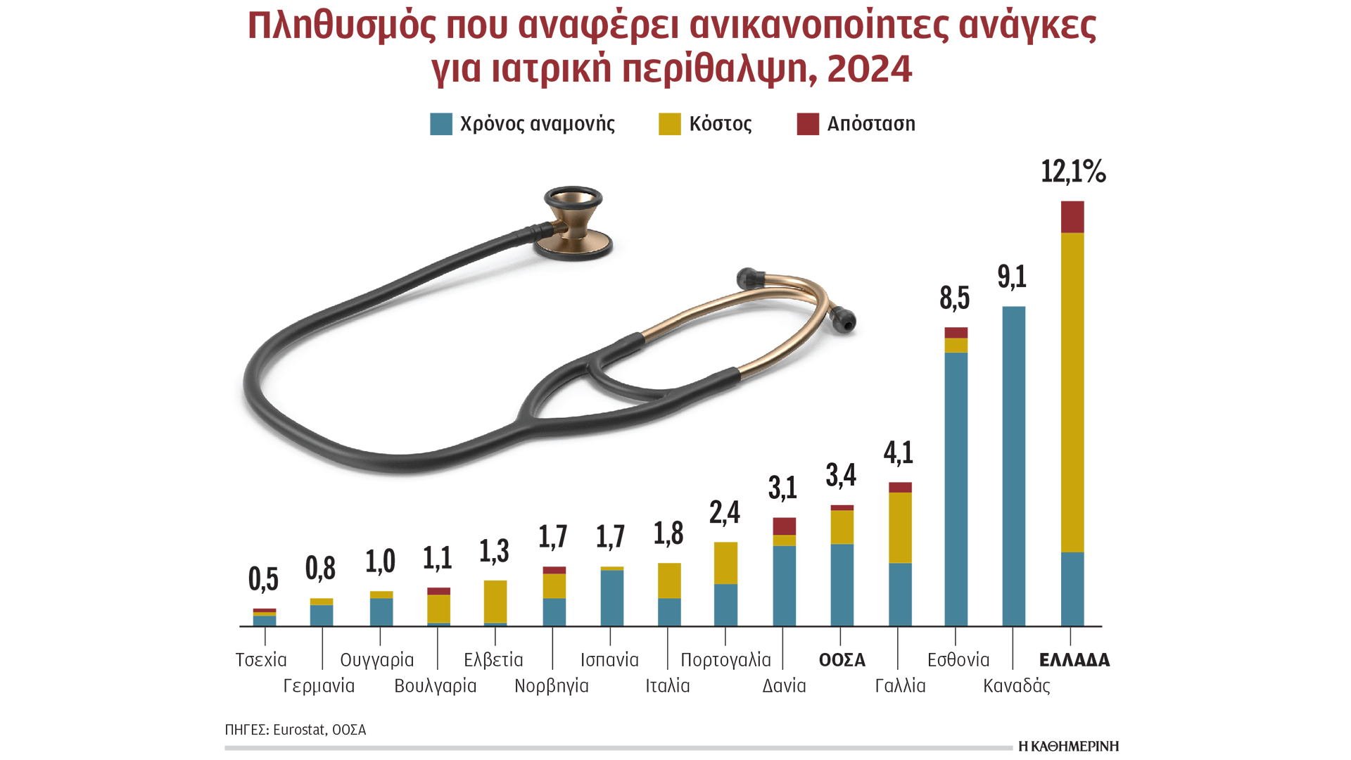 Οι ανεκπλήρωτες ανάγκες υγείας, δηλαδή αυτές που δεν ικανοποιούνται λόγω κόστους, απόστασης ή χρόνων αναμονής, είναι ίσως η πιο σκληρή έκφραση αυτής της πραγματικότητας. Πάνω από το 12% του πληθυσμού στη χώρα μας –δηλαδή πάνω από ένας στους δέκα– δηλώνουν ότι δεν έλαβαν την ιατρική φροντίδα που χρειάζονταν, όταν στις 28 χώρες του ΟΟΣΑ για τις οποίες υπάρχουν συγκρίσιμα στοιχεία, το αντίστοιχο ποσοστό είναι μόλις 3,4%.