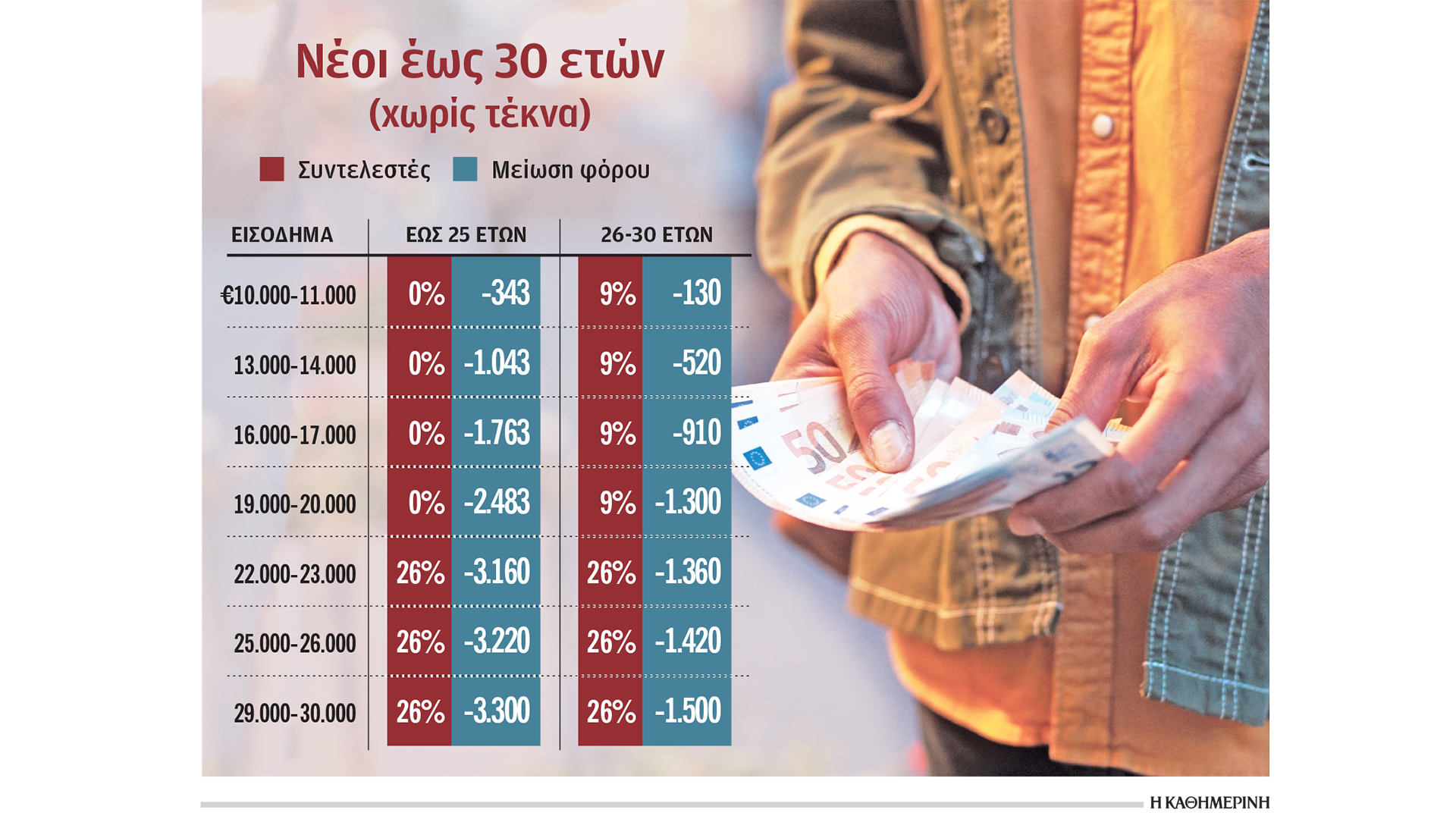Για εργαζομένους έως 25 ετών το όφελος ισοδυναμεί σχεδόν με δύο μισθούς, καθώς η μείωση φόρου κυμαίνεται από 343 ευρώ (για άτομα με το ελάχιστο εισόδημα, 10.000-11.000 ευρώ) έως 2.483 ευρώ (για όσους βρίσκονται στο ανώτερο «σκαλοπάτι» και κερδίζουν 19.000-20.000 ευρώ).