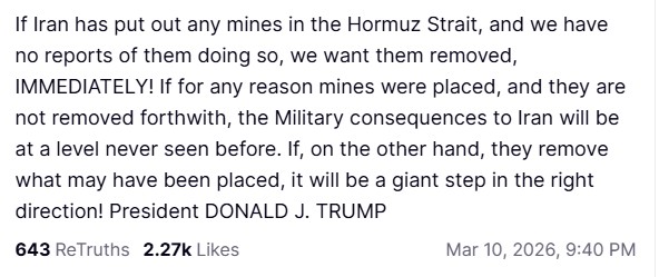 Η πτώση σημειώθηκε αφότου ο πρόεδρος των Ηνωμένων Πολιτειών, Ντόναλντ Τραμπ δήλωσε ότι ο πόλεμος με το Ιράν θα τελειώσει «αρκετά γρήγορα». Πρόσθεσε ωστόσο ότι οι ΗΠΑ δεν έχουν ακόμη «κερδίσει αρκετά».