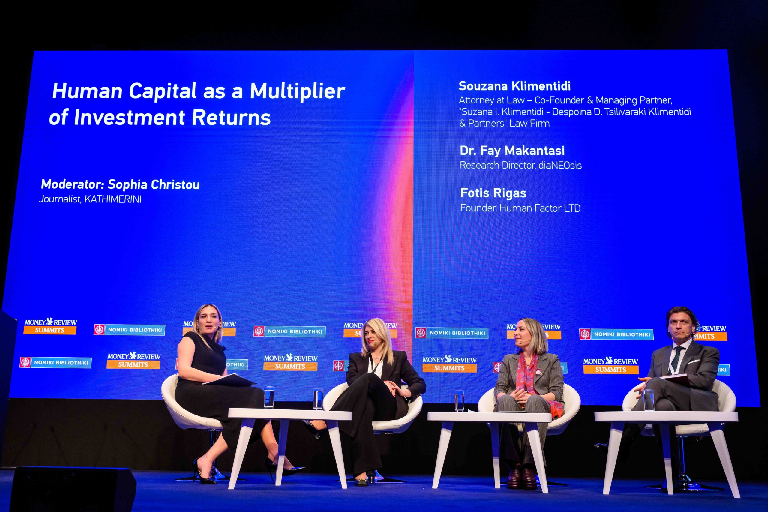 Στη θεματική ενότητα «Human Capital as a Multiplier of Investment Returns» συμμετείχαν η Σουζάνα Κλημεντίδη, συνιδρύτρια και Managing Partner της δικηγορικής εταιρείας Suzana I. Klimentidi – Despoina D. Tsilivaraki Klimentidi & Partners, η δρ Φαίη Μακαντάση, διευθύντρια Ερευνών της diaNEOsis, και ο Φώτης Ρήγας, ιδρυτής της Human Factor Ltd, υπό τον συντονισμό της Σοφίας Χρήστου, δημοσιογράφου της «Καθημερινής».