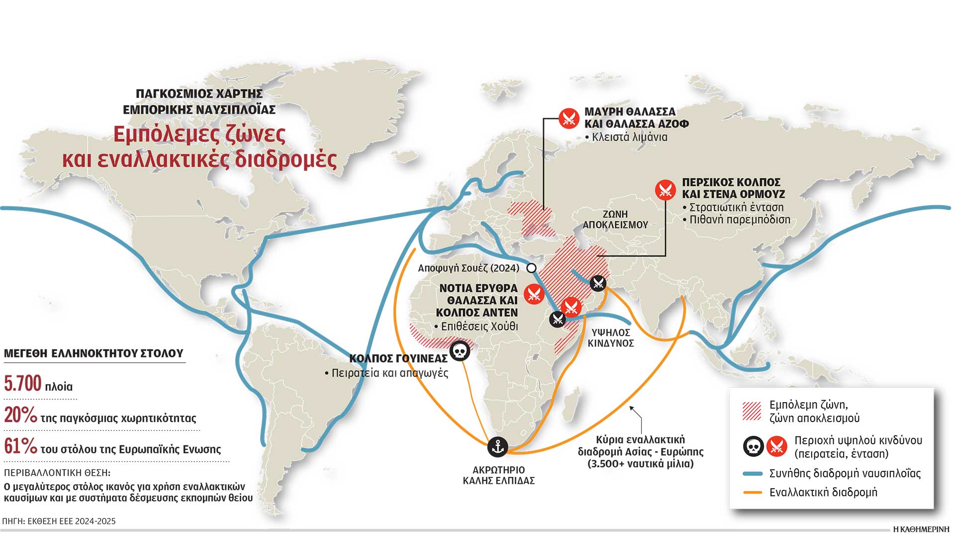 Στη δίνη αυτής της ιστορικής διαταραχής, η ελληνόκτητη ναυτιλία βρίσκεται στο επίκεντρο των εξελίξεων. Η στρατηγική της υπεροχή παραμένει αδιαμφισβήτητη: Οπως καταγράφεται στην ετήσια έκθεση 2024-2025 της Ενωσης Ελλήνων Εφοπλιστών (ΕΕΕ), ο ελληνικός στόλος αριθμεί 5.700 πλοία (άνω των 1.000 gt), διατηρώντας την παγκόσμια ηγεμονία με τον έλεγχο του 20% της παγκόσμιας χωρητικότητας και του συντριπτικού 61% της αντίστοιχης της Ευρωπαϊκής Ενωσης.