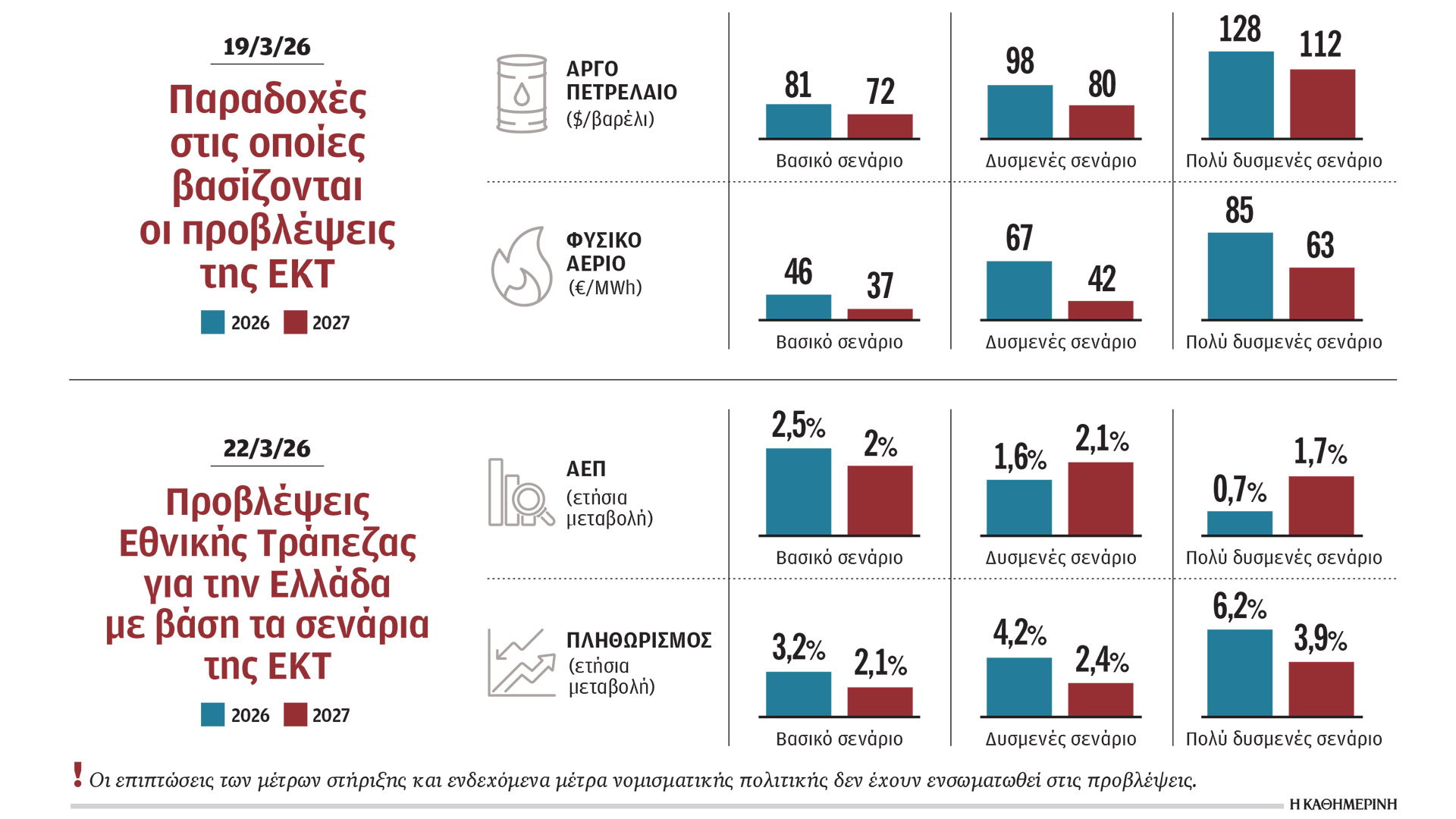 Η Εθνική Τράπεζα υπολόγισε τι σημαίνουν για την ελληνική οικονομία τα σενάρια της Ευρωπαϊκής Κεντρικής Τράπεζας που παρουσιάστηκαν στις 19 Μαρτίου. Το δυσμενές σενάριο, που δείχνει ήδη πιθανό, με την τιμή του πετρελαίου στα 98 δολάρια το βαρέλι, κατεβάζει τον ρυθμό ανάπτυξης στο 1,6% και ανεβάζει τον πληθωρισμό στο 4,2%. Το πολύ δυσμενές ή καταστροφικό, με τιμή πετρελαίου 128 δολάρια το βαρέλι, ρίχνει την ανάπτυξη στο 0,7% και ανεβάζει τον πληθωρισμό στο 6,2%. Το –αισιόδοξο πλέον– βασικό σενάριο, με τιμή πετρελαίου στα 81 δολάρια, με ομαλοποίηση το β΄ τρίμηνο και χωρίς καταστροφές υποδομών μεταφράζεται σε ρυθμό ανάπτυξης 2,5% και πληθωρισμό 3,2%.