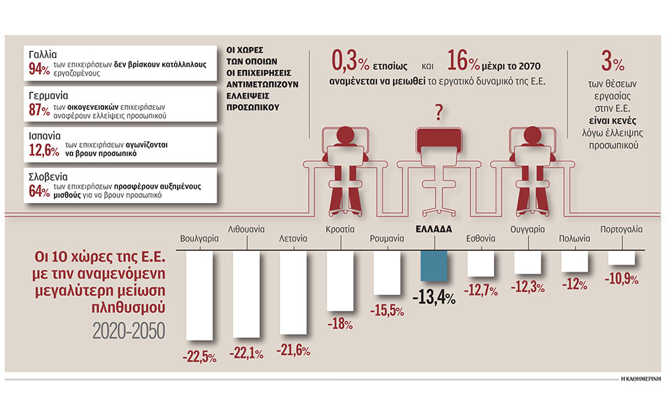 Την ίδια στιγμή, στη δεύτερη οικονομία της Ευρώπης, τη Γαλλία, πρόσφατη έρευνα μεγάλης ένωσης επιχειρήσεων, της CPME, διαπιστώνει πως το 94% των γαλλικών επιχειρήσεων δυσκολεύεται να βρει το κατάλληλο προσωπικό αλλά και γενικώς να βρει προσωπικό. Ακόμη και στην Ισπανία, όπου η ανεργία παραμένει σε υψηλά επίπεδα, 12,6% των επιχειρήσεων δηλώνουν πως κυριολεκτικά αγωνίζονται για να εξασφαλίσουν το απαιτούμενο προσωπικό και βέβαια το πρόβλημα δεν αφορά μόνον τους κλάδους υψηλής εξειδίκευσης αλλά και πολύ απλούστερους τομείς, όπως τον τουρισμό, τη γαστρονομία και τον κλάδο των κατασκευαστικών.