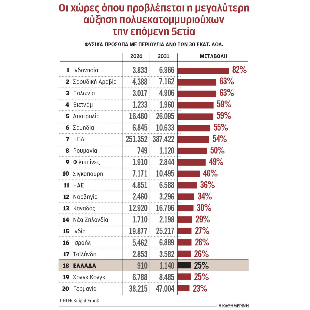 Μάλιστα, όπως επισημαίνεται στο Wealth Report, στην αύξηση του πλούτου τα επόμενα πέντε χρόνια δεν θα πρωταγωνιστήσουν οι «συνήθεις ύποπτοι», αλλά οικονομίες που ωριμάζουν με γρήγορους ρυθμούς. Η Ινδονησία βρίσκεται στην πρώτη θέση, καθώς ο πληθυσμός των πολυεκατομμυριούχων της αναμένεται να αυξηθεί κατά 82% έως το 2031, ενώ ακολουθούν από κοντά η Σαουδική Αραβία και η Πολωνία, με αύξηση άνω του 60%.